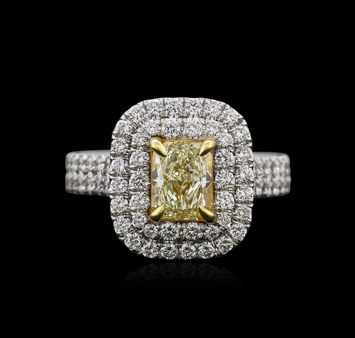 One electronically tested 18KT white and yellow gold ladies cast diamond engagement ring with a bright polish finish. Identified with markings of "18K". Condition is new. Containing: One prong set radiant shaped cut diamond, measuring 6.70 x 5.20 x 4.87mm (depth est.) stated weight of 1.39ct. Clarity: VS-2. Seventy-Eight prong set round brilliant cut diamonds, measuring 1.50 - 1.50 x 0.90mm (depth est.) approximate total weight of 78 Stones = 0.96ct. Clarity: SI-2 to I-1. Color: G - H, Cut is Good. Diamonds are graded in the mounting, unless otherwise stated. Total Weight of Diamonds 2.35ct. Total Weight of Engagement Ring 6.90 grams. GGL Appraised at $9,445.00.