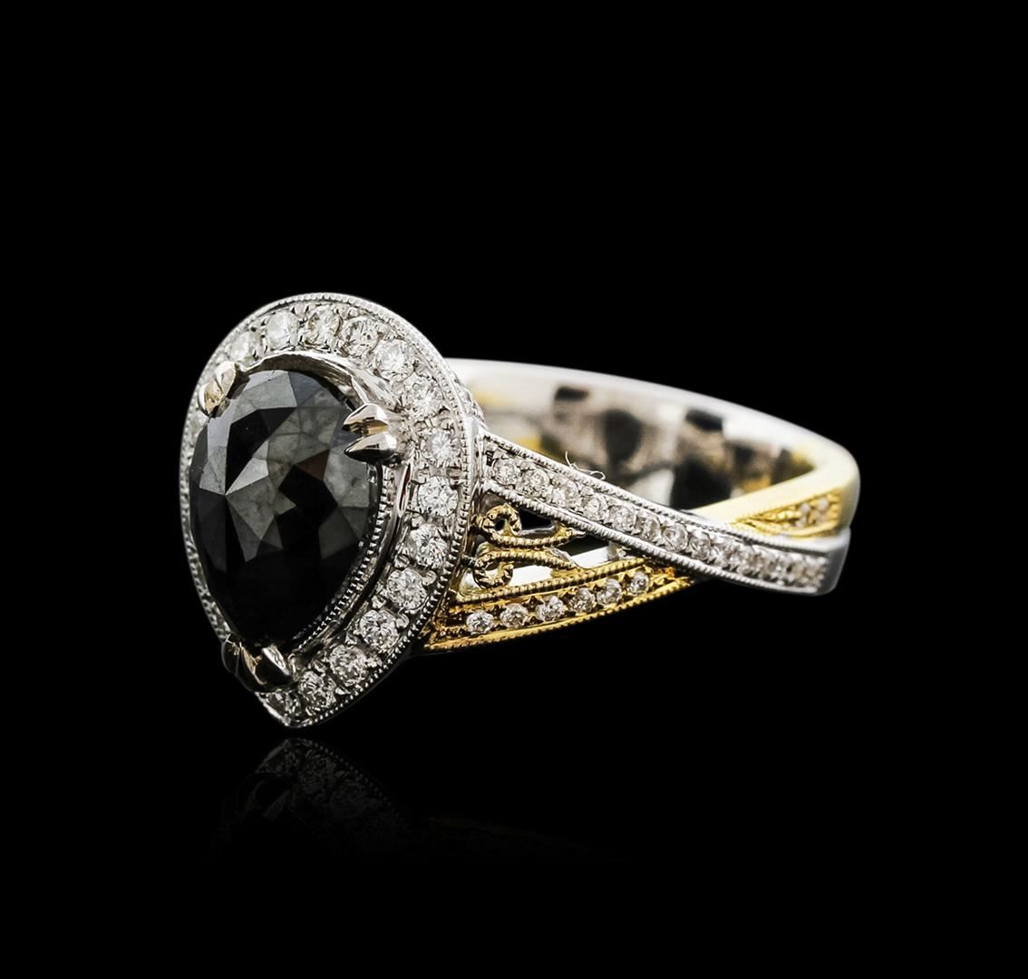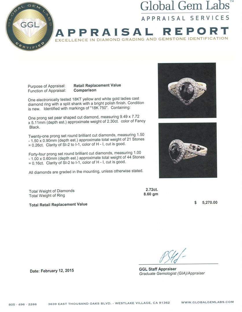 One electronically tested 18KT yellow and white gold ladies cast diamond ring with a split shank with a bright polish finish. Identified with markings of "18K 750". Condition is new. Containing: One prong set pear shaped cut diamond, measuring 9.49 x 7.72 x 5.11mm (depth est.) approximate weight of 2.30ct. Twenty-One prong set round brilliant cut diamonds, measuring 1.50 - 1.50 x 0.90mm (depth est.) approximate total weight of 21 Stones = 0.26ct. Clarity: SI-2 to I-1. Color: H - I, Cut is Good. Forty-Four prong set round brilliant cut diamonds, measuring 1.00 - 1.00 x 0.60mm (depth est.) approximate total weight of 44 Stones = 0.16ct. Clarity: SI-2 to I-1. Color: H - I, Cut is Good. All diamonds are graded in the mounting, unless otherwise stated. Total Weight of Diamonds 2.72ct. Total Weight of Ring 8.60 grams. GGL Appraised at $5,270.00.