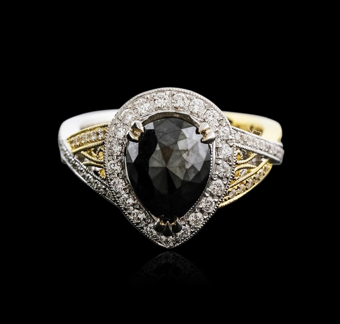 One electronically tested 18KT yellow and white gold ladies cast diamond ring with a split shank with a bright polish finish. Identified with markings of "18K 750". Condition is new. Containing: One prong set pear shaped cut diamond, measuring 9.49 x 7.72 x 5.11mm (depth est.) approximate weight of 2.30ct. Twenty-One prong set round brilliant cut diamonds, measuring 1.50 - 1.50 x 0.90mm (depth est.) approximate total weight of 21 Stones = 0.26ct. Clarity: SI-2 to I-1. Color: H - I, Cut is Good. Forty-Four prong set round brilliant cut diamonds, measuring 1.00 - 1.00 x 0.60mm (depth est.) approximate total weight of 44 Stones = 0.16ct. Clarity: SI-2 to I-1. Color: H - I, Cut is Good. All diamonds are graded in the mounting, unless otherwise stated. Total Weight of Diamonds 2.72ct. Total Weight of Ring 8.60 grams. GGL Appraised at $5,270.00.