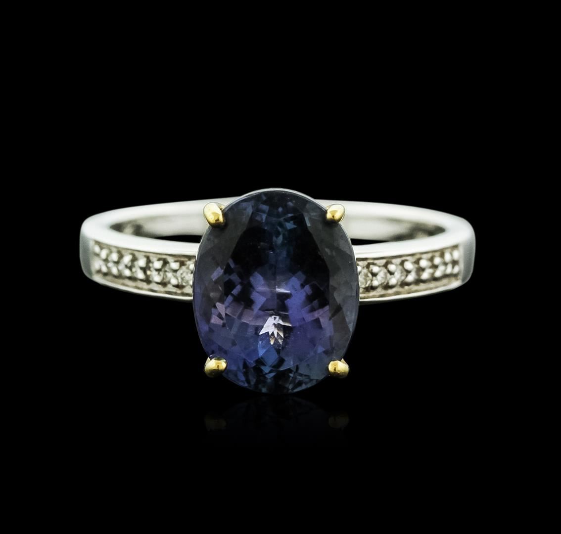 One electronically tested 18KT white and yellow gold ladies cast tanzanite and diamond ring with a bright polish finish. Identified with markings of "18K". Condition is new. Containing: One prong set oval modified brilliant cut natural tanzanite, measuring 10.00 x 8.20 x 5.33mm, approximate weight of 3.07ct., clarity is eye clean, type I, medium light, very slightly grayish, violet color, (GIA V 4/3), cut is good. Twenty-Eight prong set round brilliant cut diamonds, measuring 1.20 - 1.20 x 0.72mm (depth est.) approximate total weight of 28 Stones = 0.18ct. Clarity: I-1 to I-2. Color: I - J. Colored gemstones are presumed to have been subjected to commonly used enhancement processes. All diamonds and colored gemstones are graded in the mounting, unless otherwise stated. Total Weight of Colored Stones 3.07ct. Total Weight of Diamonds 0.18ct. Total Weight of Ring 4.30 grams. GGL Appraised at $2,955.00.