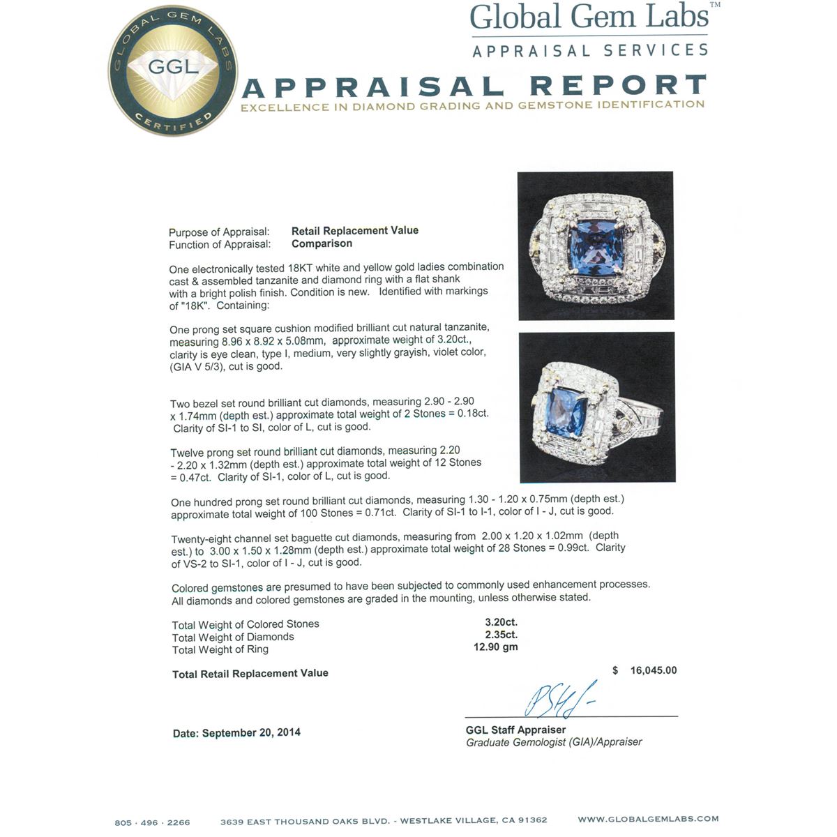 One electronically tested 18KT white and yellow gold ladies combination cast & assembled tanzanite and diamond ring with a flat shank with a bright polish finish. Identified with markings of "18K". Condition is new. Containing: One prong set square cushion modified brilliant cut natural tanzanite, measuring 8.96 x 8.92 x 5.08mm, approximate weight of 3.20ct., clarity is eye clean, type I, medium, very slightly grayish, violet color, (GIA V 5/3), cut is good. Two bezel set round brilliant cut diamonds, measuring 2.90 - 2.90 x 1.74mm (depth est.) approximate total weight of 2 Stones = 0.18ct. Clarity: SI-1 to SI. Color: L, Cut is Good. Twelve prong set round brilliant cut diamonds, measuring 2.20 - 2.20 x 1.32mm (depth est.) approximate total weight of 12 Stones = 0.47ct. Clarity: SI-1. Color: L, Cut is Good. One Hundred prong set round brilliant cut diamonds, measuring 1.30 - 1.20 x 0.75mm (depth est.) approximate total weight of 100 Stones = 0.71ct. Clarity: SI-1 to I-1. Color: I - J, Cut is Good. Twenty-Eight channel set baguette cut diamonds, measuring from 2.00 x 1.20 x 1.02mm (depth est.) to 3.00 x 1.50 x 1.28mm (depth est.) approximate total weight of 28 Stones = 0.99ct. Clarity: VS-2 to SI-1. Color: I - J, Cut is Good. Colored gemstones are presumed to have been subjected to commonly used enhancement processes. All diamonds and colored gemstones are graded in the mounting, unless otherwise stated. Total Weight of Colored Stones 3.20ct. Total Weight of Diamonds 2.35ct. Total Weight of Ring 12.90 grams. GGL Appraised at $16,045.00.
