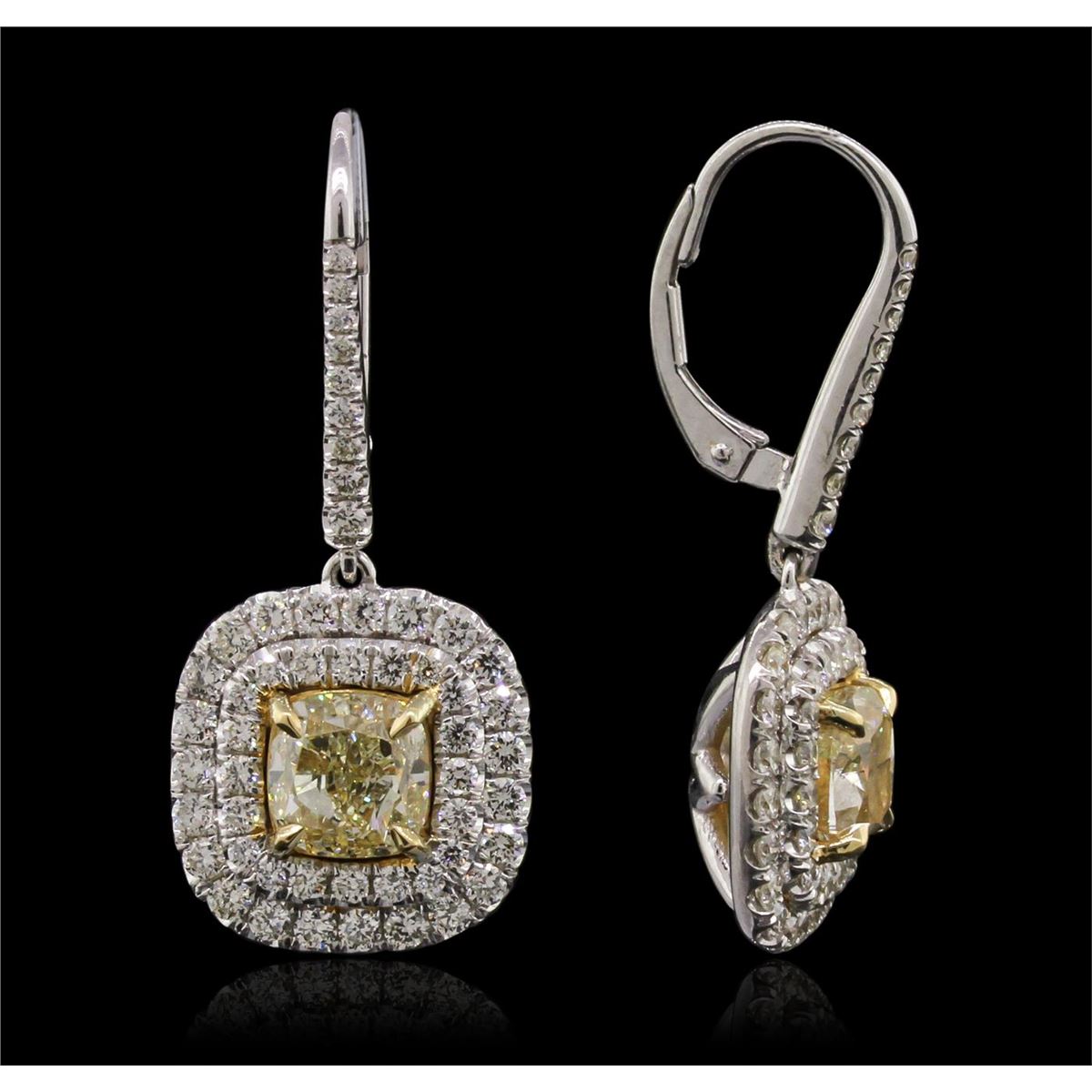 One pair electronically tested 18KT yellow & white gold ladies cast & assembled diamond dangle style earrings with lever backs. Condition is new, good workmanship. Bright polish finish. Trademark is FI. Identified with markings of "18K". Containing: Two prong set cushion cut diamonds, measuring 6.90 x 6.60 x 4.09mm (depth est.), 12.00.%. GTCF approximate. Total Weight of 2 Stones = 3.88ct. Measurements, clarity & the color grade are an average for the pair. Graded in the setting. Clarity: VS-1 Thirty prong set round brilliant cut diamonds, measuring 1.60 - 1.50 x 0.93mm (depth est.) approximate. Total Weight of 30 Stones = 0.51ct. Graded in the setting. Clarity: SI-1 to I-1. Color: G - I Twenty-Eight prong set round brilliant cut diamonds, measuring 1.30 - 1.10 x 0.72mm (depth est.) approximate. Total Weight of 28 Stones = 0.26ct. Graded in the setting. Clarity: SI-1 to I-1. Color: G - I Forty-Six prong set round brilliant cut diamonds, measuring 1.90 - 1.80 x 1.11mm (depth est.) approximate. Total Weight of 46 Stones = 1.16ct. Graded in the setting. Clarity: SI-1 to I-1. Color: G - I. Total Weight of Diamonds 5.81ct. Total Weight of Earrings 12.80 grams. AIG Appraised at $49,925.00.