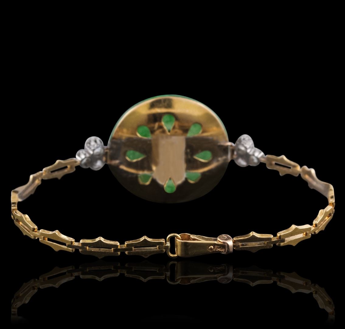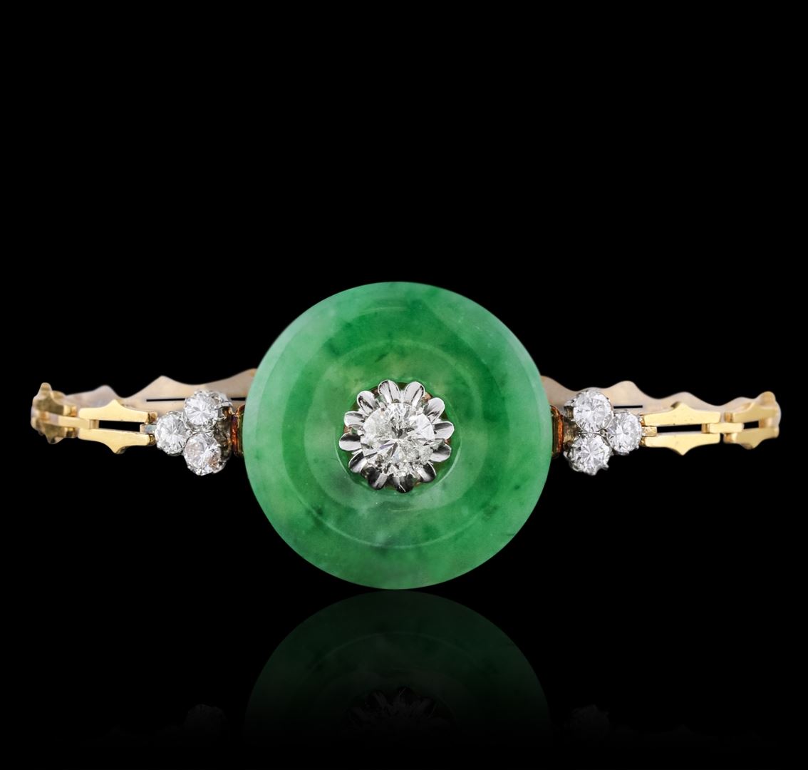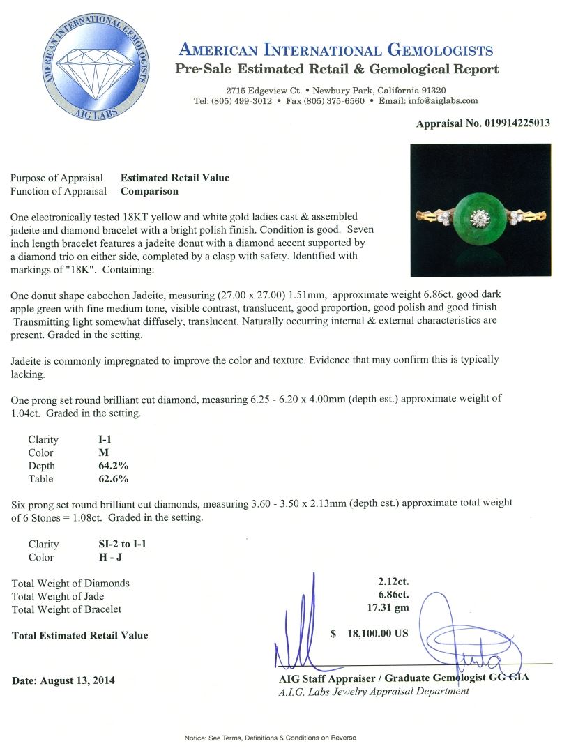 One electronically tested 18KT yellow and white gold ladies cast & assembled jadeite and diamond bracelet with a bright polish finish. Seven inch length bracelet features a jadeite donut with a diamond accent supported by a diamond trio on either side, completed by a clasp with safety. Identified with markings of "18K". Condition is good. Containing: One donut shape cabochon Jadeite, measuring (27.00 x 27.00.) 1.51mm, approximate weight 6.86ct. good dark apple green with fine medium tone, visible contrast, translucent, good proportion, good polish and good finish Transmitting light somewhat diffusely, translucent. Naturally occurring internal & external characteristics are present. Graded in the setting. Jadeite is commonly impregnated to improve the color and texture. Evidence that may confirm this is typically lacking. One prong set round brilliant cut diamond, measuring 6.25 - 6.20 x 4.00mm (depth est.) approximate weight of 1.04ct. Graded in the setting. Clarity: I-1. Color: M. Depth 64.2%. Table 62.6%. Six prong set round brilliant cut diamonds, measuring 3.60 - 3.50 x 2.13mm (depth est.) approximate total weight of 6 Stones = 1.08ct. Graded in the setting. Clarity: SI-2 to I-1. Color: H - J. Total Weight of Diamonds 2.12ct. Total Weight of Jade 6.86ct. Total Weight of Bracelet 17.31 grams. AIG Appraised at $18,100.00.