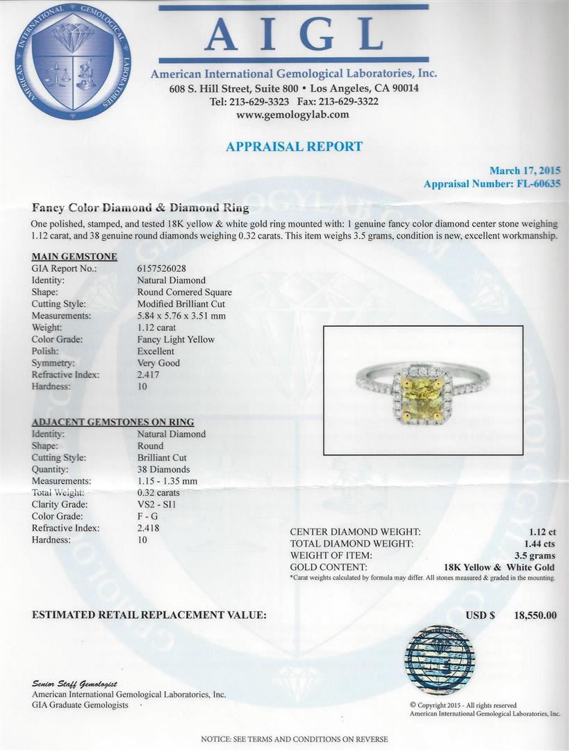 One polished, stamped, and tested 18K yellow & white gold ring mounted with: 1 genuine fancy color diamond center stone weighing 1.12 carat, and 38 genuine round diamonds weighing 0.32 carats. This item weighs 3.5 grams, condition is new, excellent workmanship. MAIN GEMSTONE: GIA Report No.: 6157526028. Identity: Natural Diamond. Shape: Round Cornered Square. Cutting Style: Modified Brilliant Cut. Measurements: 5.84 x 5.76 x 3.51 mm. Weight: 1.12 carat. Color Grade: Fancy Light Yellow. Polish: Excellent. Symmetry: Very Good. Refractive Index: 2.417. Hardness: 10. ADJACENT GEMSTONES ON RING: Identity: Natural Diamond. Shape: Round. Cutting Style: Brilliant Cut. Quantity: 38 Diamonds. Measurements: 1.15 - 1.35 mm. Total Weight: 0.32 carats. Clarity Grade: VS2 - SI1. Color Grade: F - G. Refractive Index: 2.418. Hardness: 10. Center Diamond Weight: 1.12 ct. Total Diamond Weight: 1.44 cts. Weight of Item: 3.5 grams. Gold Content: 18K Yellow & White Gold. AIGL Appraised at $18,550.00.