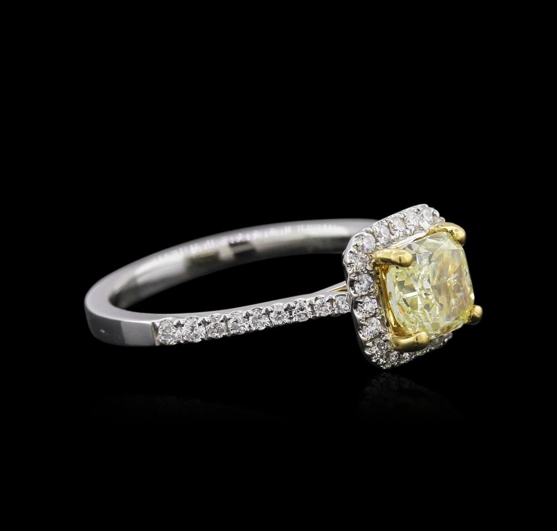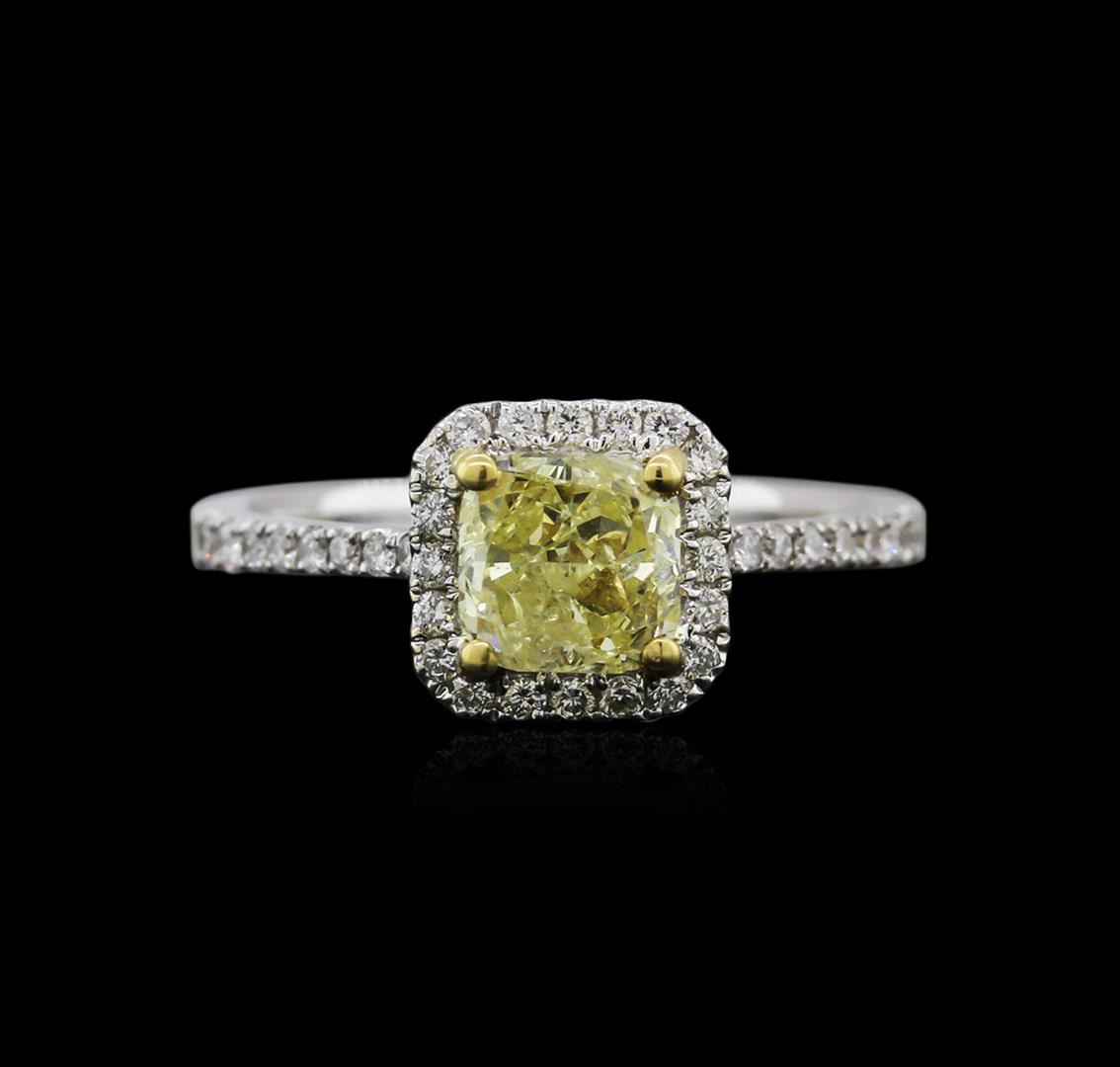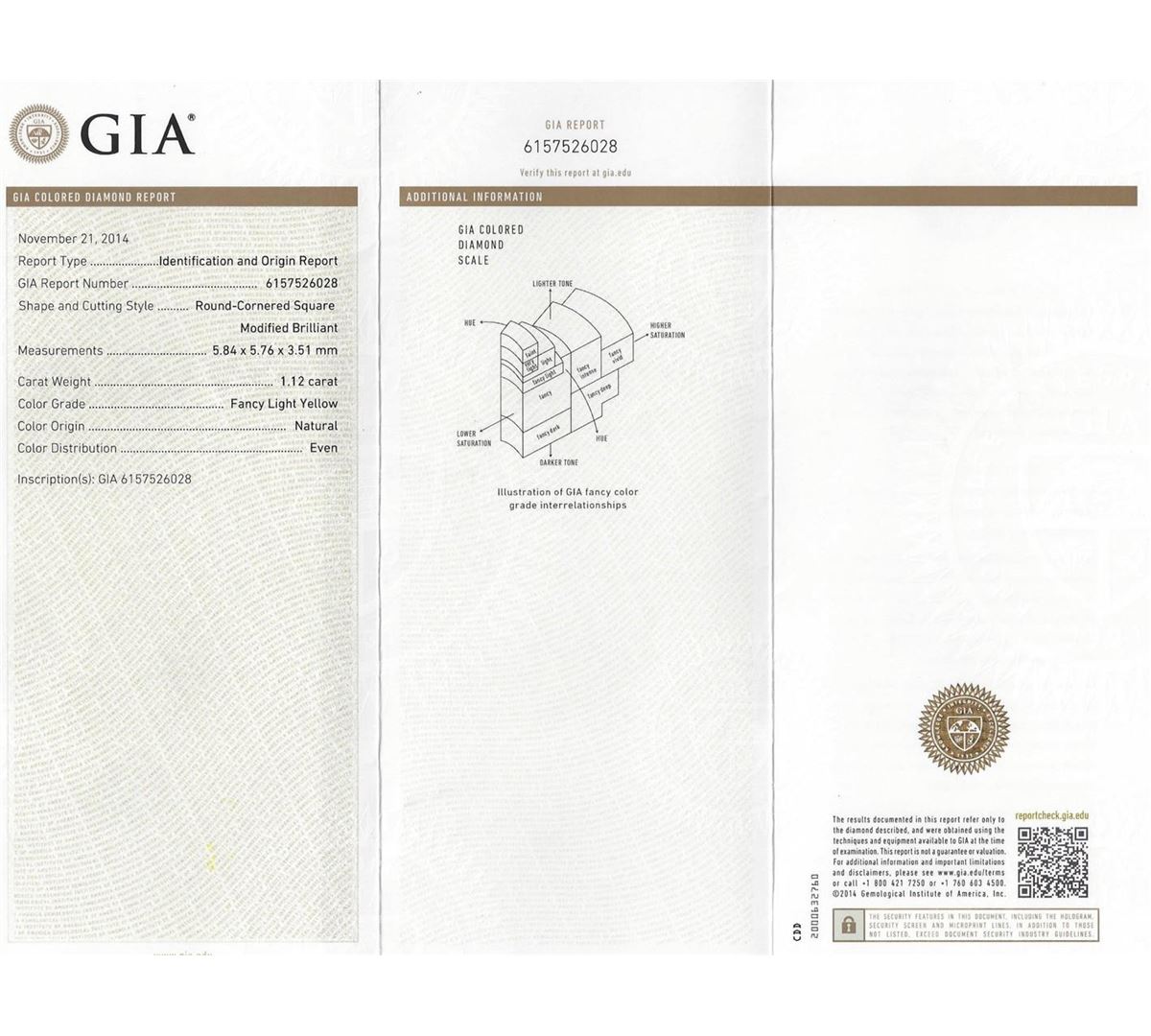 One polished, stamped, and tested 18K yellow & white gold ring mounted with: 1 genuine fancy color diamond center stone weighing 1.12 carat, and 38 genuine round diamonds weighing 0.32 carats. This item weighs 3.5 grams, condition is new, excellent workmanship. MAIN GEMSTONE: GIA Report No.: 6157526028. Identity: Natural Diamond. Shape: Round Cornered Square. Cutting Style: Modified Brilliant Cut. Measurements: 5.84 x 5.76 x 3.51 mm. Weight: 1.12 carat. Color Grade: Fancy Light Yellow. Polish: Excellent. Symmetry: Very Good. Refractive Index: 2.417. Hardness: 10. ADJACENT GEMSTONES ON RING: Identity: Natural Diamond. Shape: Round. Cutting Style: Brilliant Cut. Quantity: 38 Diamonds. Measurements: 1.15 - 1.35 mm. Total Weight: 0.32 carats. Clarity Grade: VS2 - SI1. Color Grade: F - G. Refractive Index: 2.418. Hardness: 10. Center Diamond Weight: 1.12 ct. Total Diamond Weight: 1.44 cts. Weight of Item: 3.5 grams. Gold Content: 18K Yellow & White Gold. AIGL Appraised at $18,550.00.