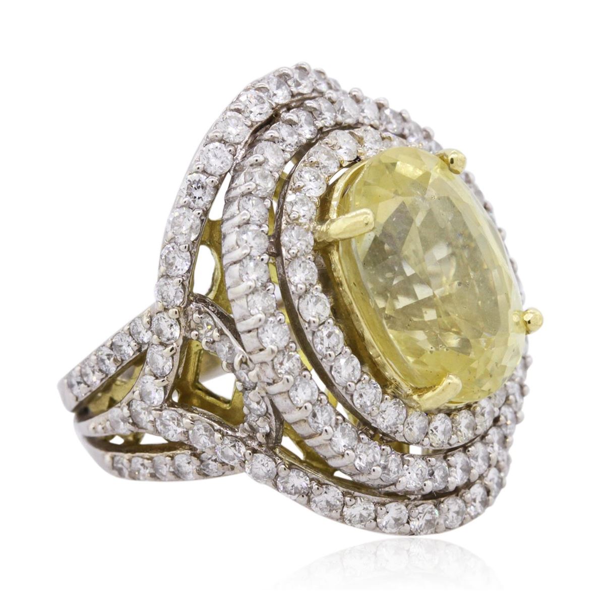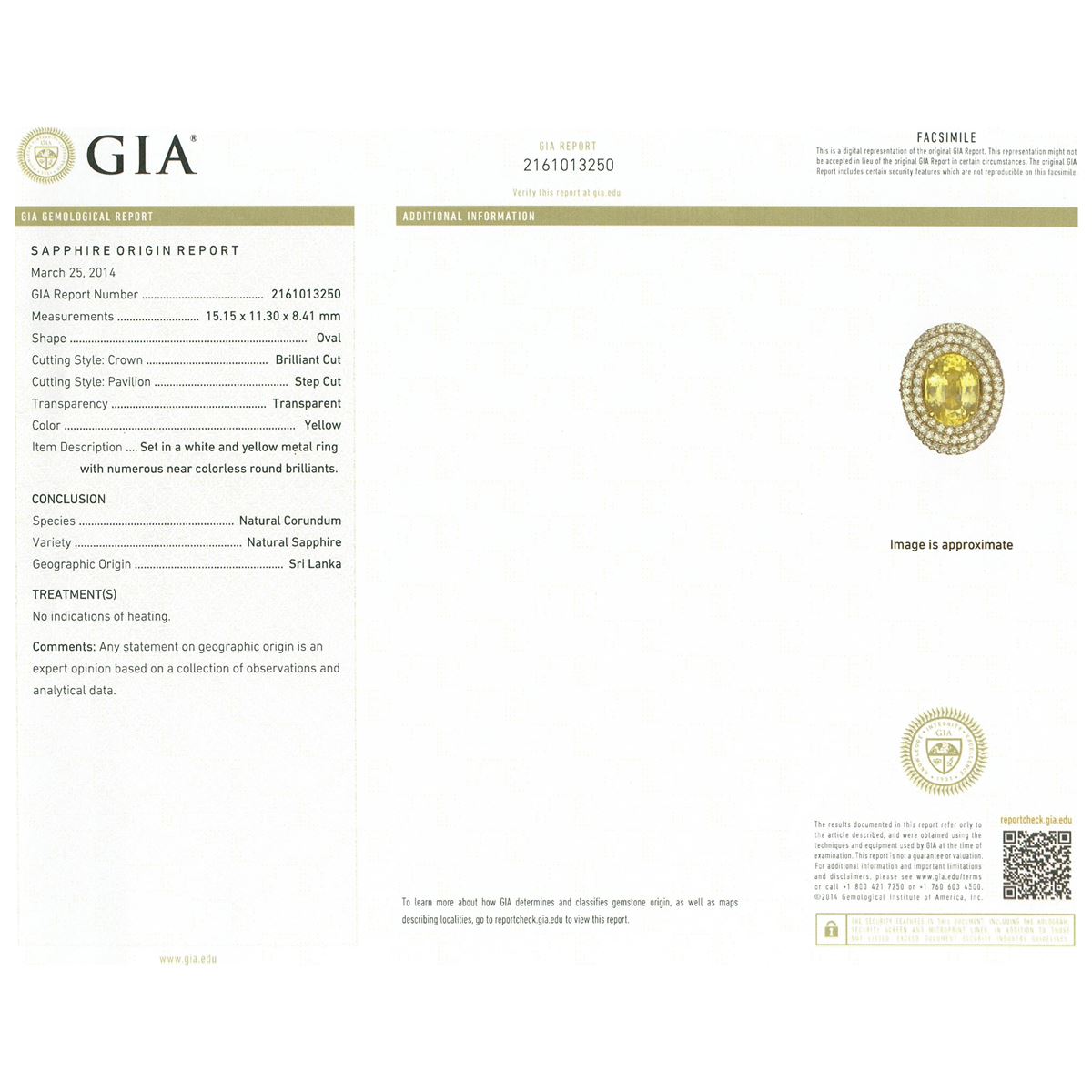 One electronically tested 18KT white and yellow gold ladies cast yellow sapphire and diamond ring with a bright polish finish. The featured yellow sapphire is set within tiered diamond bezels supported by elaborate diamond set shoulders, completed by a three and one-half millimeter wide band. Identified with markings of "18K". Condition is new, good workmanship. Containing: One prong set oval mixed cut natural yellow sapphire, measuring 15.15 x 11.30 x 8.41mm, 6%. bulge factor, approximate weight of 12.47ct., clarity is slightly included, type II, medium, moderately strong, yellow color, (GIA Y 5/4), cut is good. Transmitting light with a minimum of distortion, transparent. Naturally occurring internal & external characteristics are present. No indications of heating. GIA Gemological Report attached. Graded in the GIA Laboratory, Report #2161013250.One Hundred Thirty-Eight prong set round brilliant cut diamonds, measuring 2.00 - 1.80 x 1.14mm (depth est.) approximate total weight of 138 Stones = 3.56ct. Graded in the setting. Clarity: SI-1 to I-1. Color: G - I. Total Weight of Colored Stones 12.47ct. Total Weight of Diamonds 3.56ct. Total Weight of Ring 19.90 grams. AIG Appraised at $76,525.00.