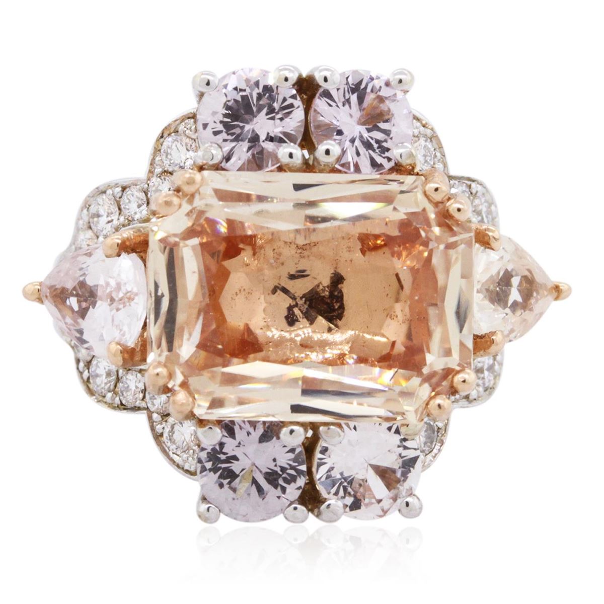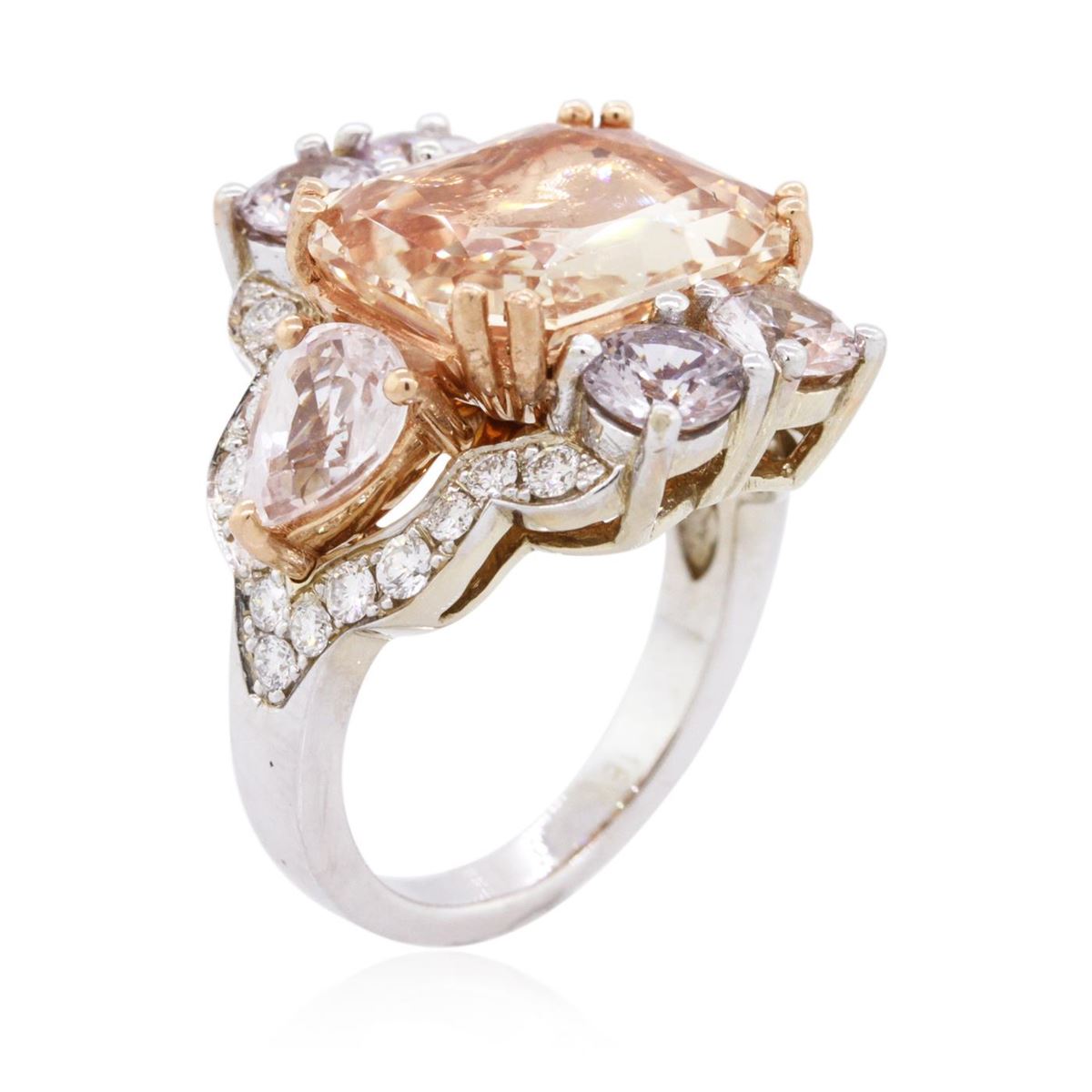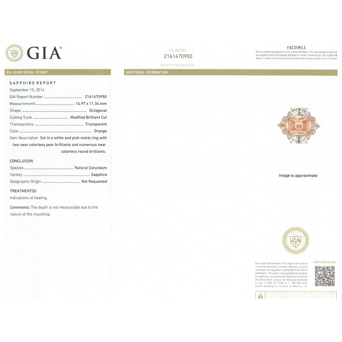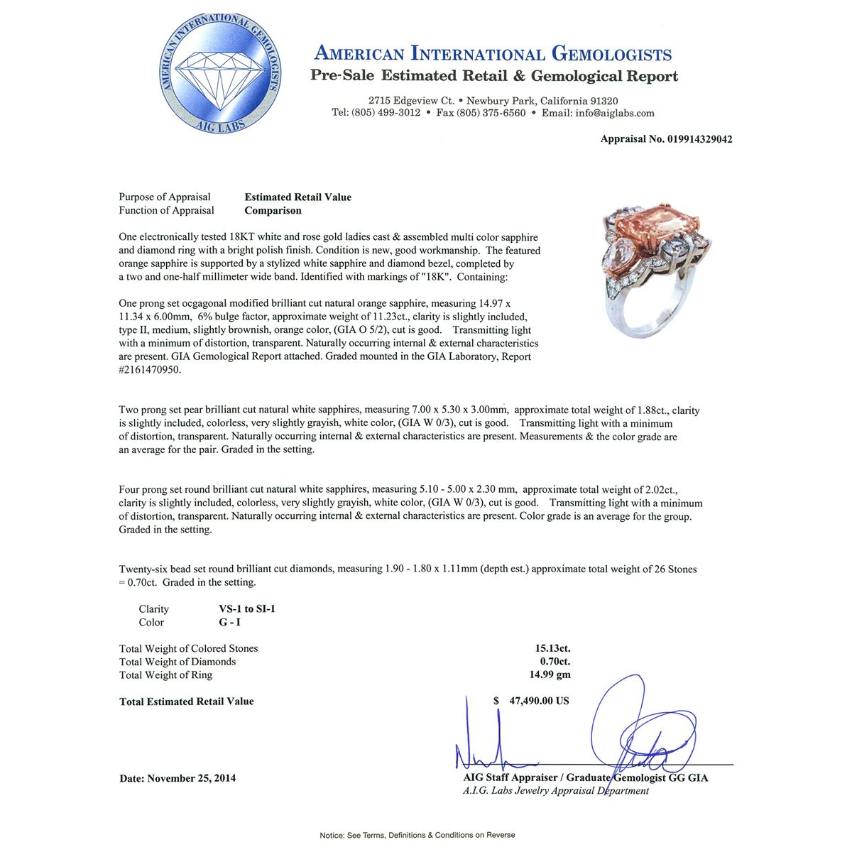 One electronically tested 18KT white and rose gold ladies cast & assembled multi color sapphire and diamond ring with a bright polish finish. The featured orange sapphire is supported by a stylized white sapphire and diamond bezel, completed by a two and one-half millimeter wide band. Identified with markings of "18K". Condition is new, good workmanship. Containing: One prong set octagonal modified brilliant cut natural orange sapphire, measuring 14.97 x 11.34 x 6.00mm, 6%. bulge factor, approximate weight of 11.23ct., clarity is slightly included, type II, medium, slightly brownish, orange color, (GIA O 5/2), cut is good. Transmitting light with a minimum of distortion, transparent. Naturally occurring internal & external characteristics are present. GIA Gemological Report attached. Graded mounted in the GIA Laboratory, Report #2161470950.Two prong set pear brilliant cut natural white sapphires, measuring 7.00 x 5.30 x 3.00mm, approximate total weight of 1.88ct., clarity is slightly included, colorless, very slightly grayish, white color, (GIA W 0/3), cut is good. Transmitting light with a minimum of distortion, transparent. Naturally occurring internal & external characteristics are present. Measurements & the color grade are an average for the pair. Graded in the setting. Four prong set round brilliant cut natural white sapphires, measuring 5.10 - 5.00 x 2.30 mm, approximate total weight of 2.02ct., clarity is slightly included, colorless, very slightly grayish, white color, (GIA W 0/3), cut is good. Transmitting light with a minimum of distortion, transparent. Naturally occurring internal & external characteristics are present. Color grade is an average for the group. Graded in the setting. Twenty-Six bead set round brilliant cut diamonds, measuring 1.90 - 1.80 x 1.11mm (depth est.) approximate total weight of 26 Stones = 0.70ct. Graded in the setting. Clarity: VS-1 to SI-1. Color: G - I. Total Weight of Colored Stones 15.13ct. Total Weight of Diamonds 0.70ct. Total Weight of Ring 14.99 grams. AIG Appraised at $47,490.00.