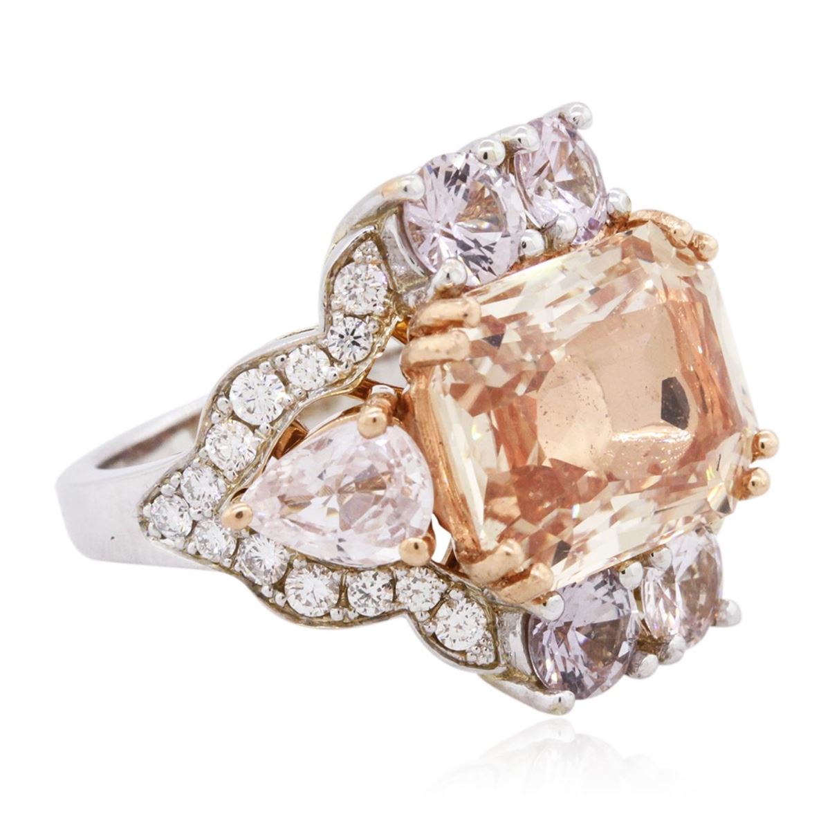 One electronically tested 18KT white and rose gold ladies cast & assembled multi color sapphire and diamond ring with a bright polish finish. The featured orange sapphire is supported by a stylized white sapphire and diamond bezel, completed by a two and one-half millimeter wide band. Identified with markings of "18K". Condition is new, good workmanship. Containing: One prong set octagonal modified brilliant cut natural orange sapphire, measuring 14.97 x 11.34 x 6.00mm, 6%. bulge factor, approximate weight of 11.23ct., clarity is slightly included, type II, medium, slightly brownish, orange color, (GIA O 5/2), cut is good. Transmitting light with a minimum of distortion, transparent. Naturally occurring internal & external characteristics are present. GIA Gemological Report attached. Graded mounted in the GIA Laboratory, Report #2161470950.Two prong set pear brilliant cut natural white sapphires, measuring 7.00 x 5.30 x 3.00mm, approximate total weight of 1.88ct., clarity is slightly included, colorless, very slightly grayish, white color, (GIA W 0/3), cut is good. Transmitting light with a minimum of distortion, transparent. Naturally occurring internal & external characteristics are present. Measurements & the color grade are an average for the pair. Graded in the setting. Four prong set round brilliant cut natural white sapphires, measuring 5.10 - 5.00 x 2.30 mm, approximate total weight of 2.02ct., clarity is slightly included, colorless, very slightly grayish, white color, (GIA W 0/3), cut is good. Transmitting light with a minimum of distortion, transparent. Naturally occurring internal & external characteristics are present. Color grade is an average for the group. Graded in the setting. Twenty-Six bead set round brilliant cut diamonds, measuring 1.90 - 1.80 x 1.11mm (depth est.) approximate total weight of 26 Stones = 0.70ct. Graded in the setting. Clarity: VS-1 to SI-1. Color: G - I. Total Weight of Colored Stones 15.13ct. Total Weight of Diamonds 0.70ct. Total Weight of Ring 14.99 grams. AIG Appraised at $47,490.00.