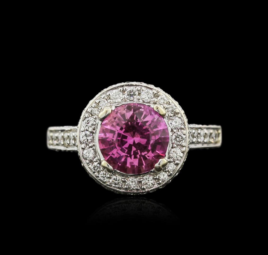 One electronically tested 18KT white and yellow gold ladies cast sapphire and diamond ring with a bright polish finish. Identified with markings of "18K". Condition is very good. Containing: One prong set round modified brilliant cut natural pink sapphire, measuring 7.40 - 7.47 x 4.85 mm, approximate weight of 2.12ct., clarity is eye clean, type II, medium light, very slightly grayish, purple red color, (GIA PR 4/3), cut is good. GIA report: 6177010915.One Hundred Thirty-Four prong set round brilliant cut diamonds, measuring 1.40 - 1.10 x 0.75mm (depth est.) approximate total weight of 134 Stones = 0.95ct. Clarity: SI-2 to I-1. Color: H - I, Cut is Good. Colored gemstones are presumed to have been subjected to commonly used enhancement processes. All diamonds and colored gemstones are graded in the mounting, unless otherwise stated. Total Weight of Colored Stones 2.12ct. Total Weight of Diamonds 0.95ct. Total Weight of Ring 5.80 grams. GGL Appraised at $7,370.00.
