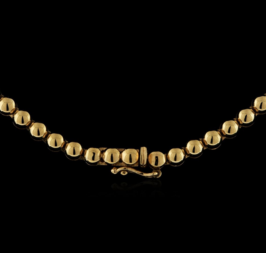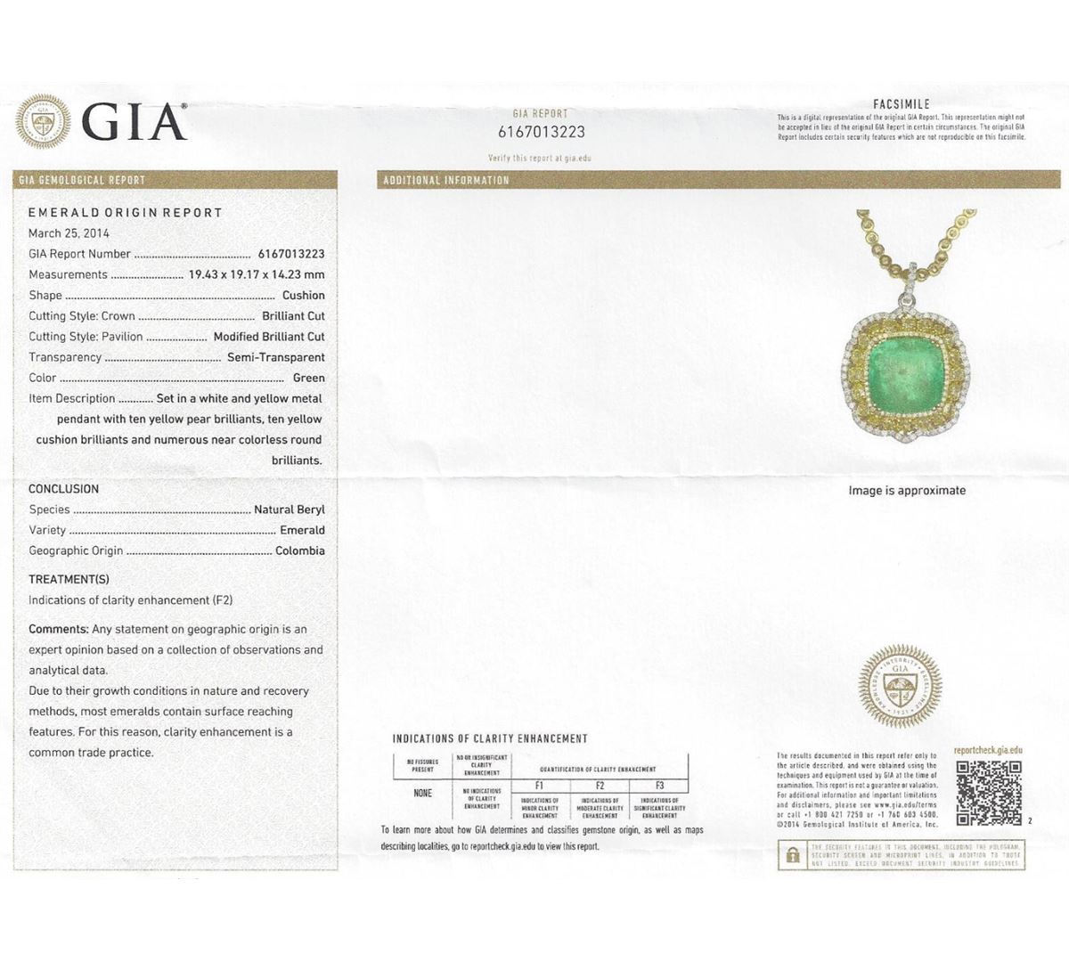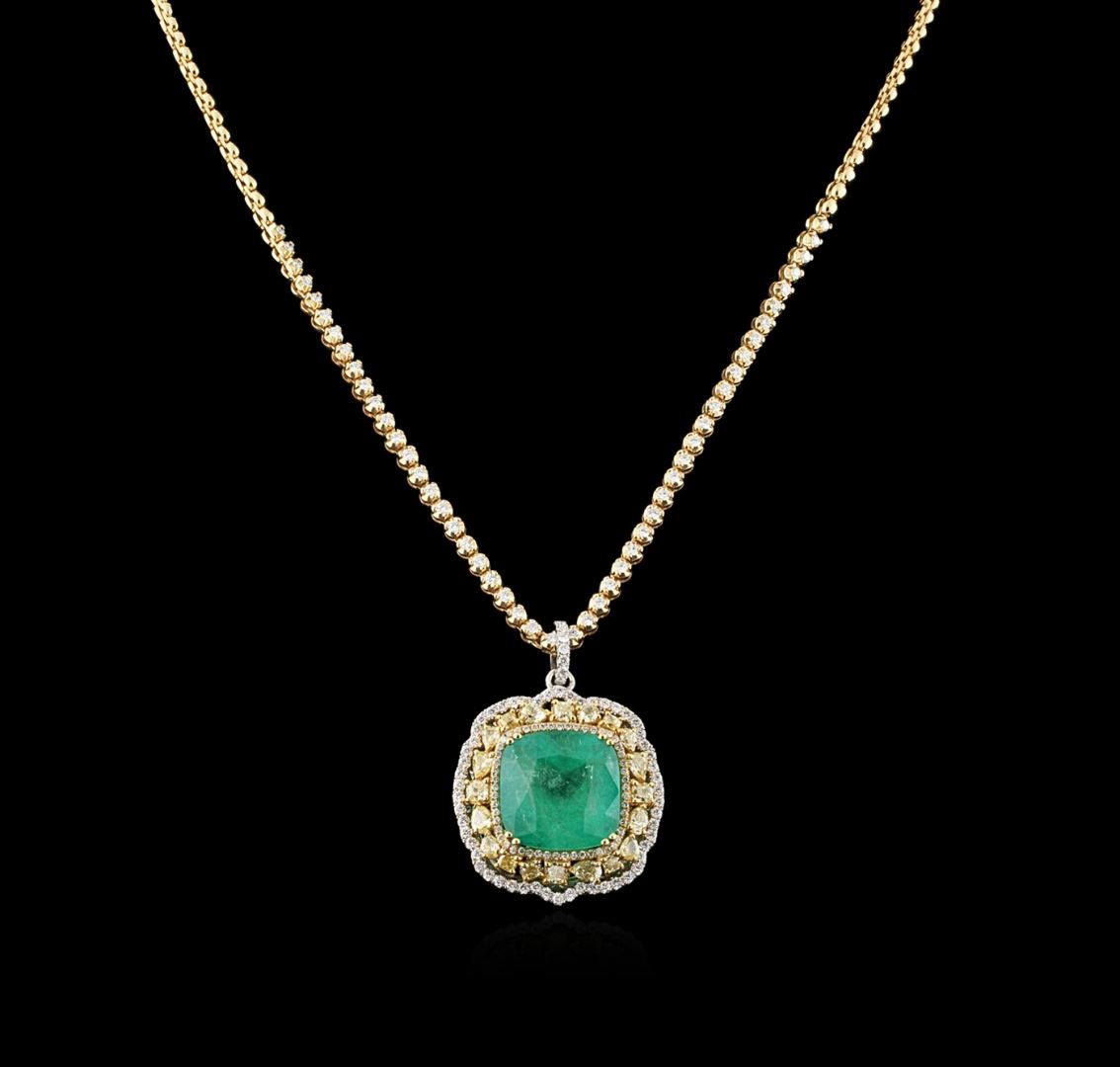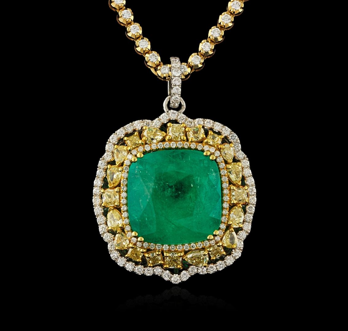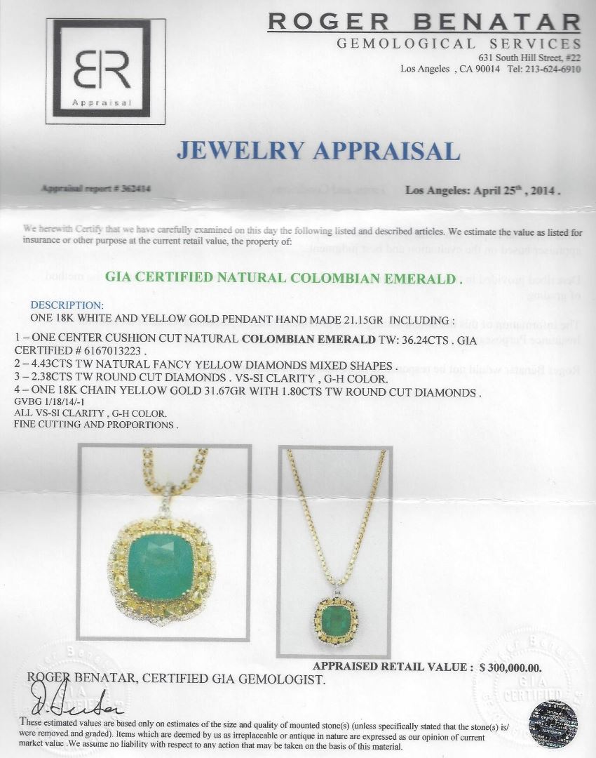 One 18K white and yellow gold pendant hand made 21.15 grams including: One center cushion cut natural Colombian emerald with a weight of 36.24ct. GIA Certified #6167013223. 4.43cts TW natural fancy yellow diamonds mixed shapes. 2.38cts TW round cut diamonds. VS-SI clarity, G-H color. One 18K chain yellow gold 31.67gr with 1.80cts TW round cut diamonds. All VS-SI clarity, G-H color. Fine cutting and proportions. RBGS Appraised at $300,000.00.