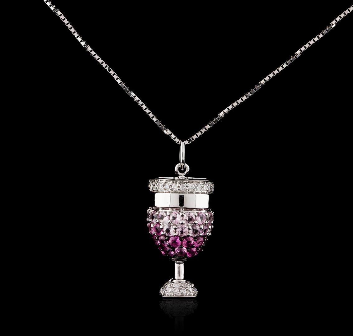 One pendant with chain featuring: 18KT white gold weighing 3.02 grams containing pink sapphires with a total weight of 0.15ct and diamonds with a total weight of 0.25ct.