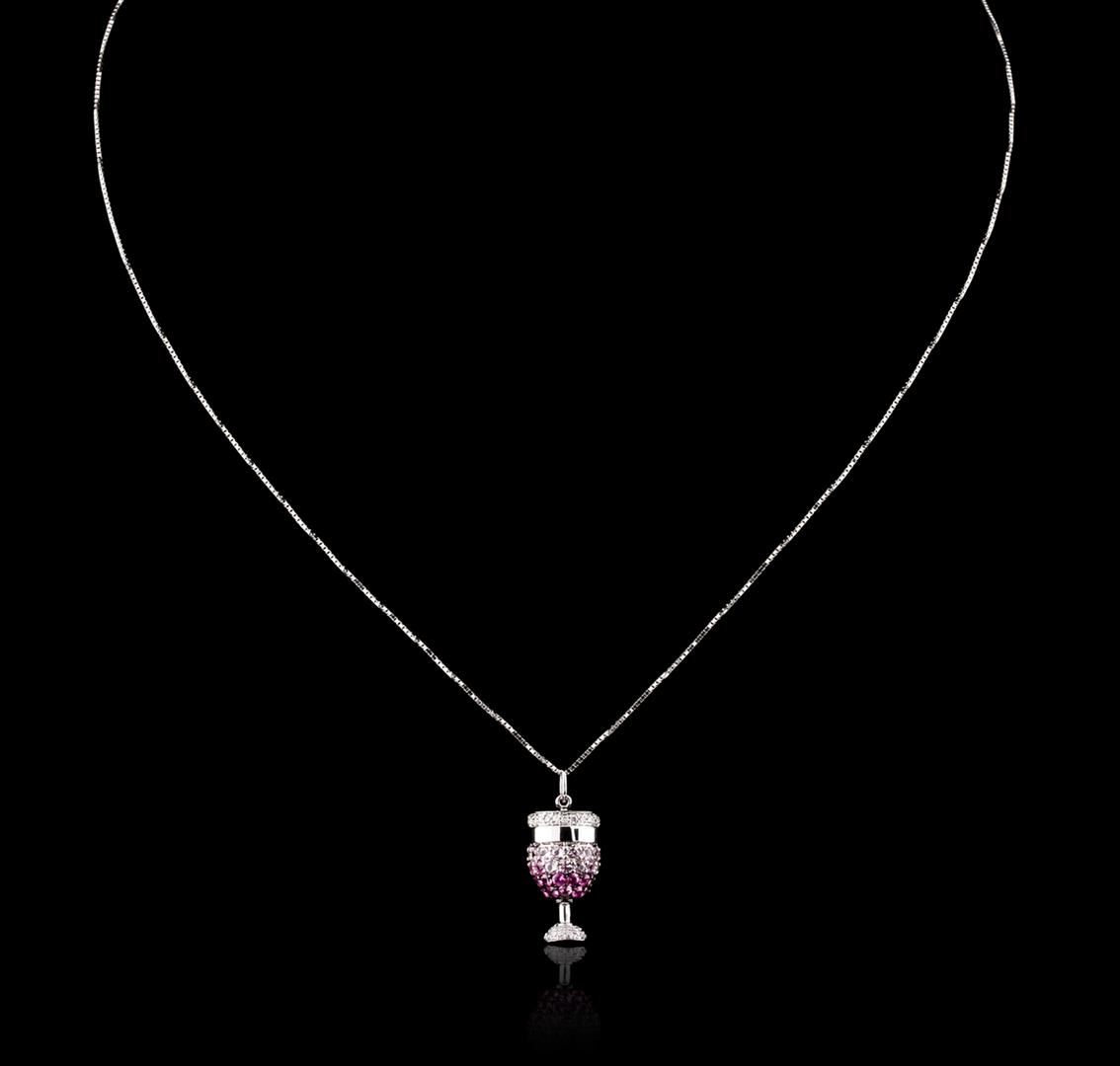 One pendant with chain featuring: 18KT white gold weighing 3.02 grams containing pink sapphires with a total weight of 0.15ct and diamonds with a total weight of 0.25ct.