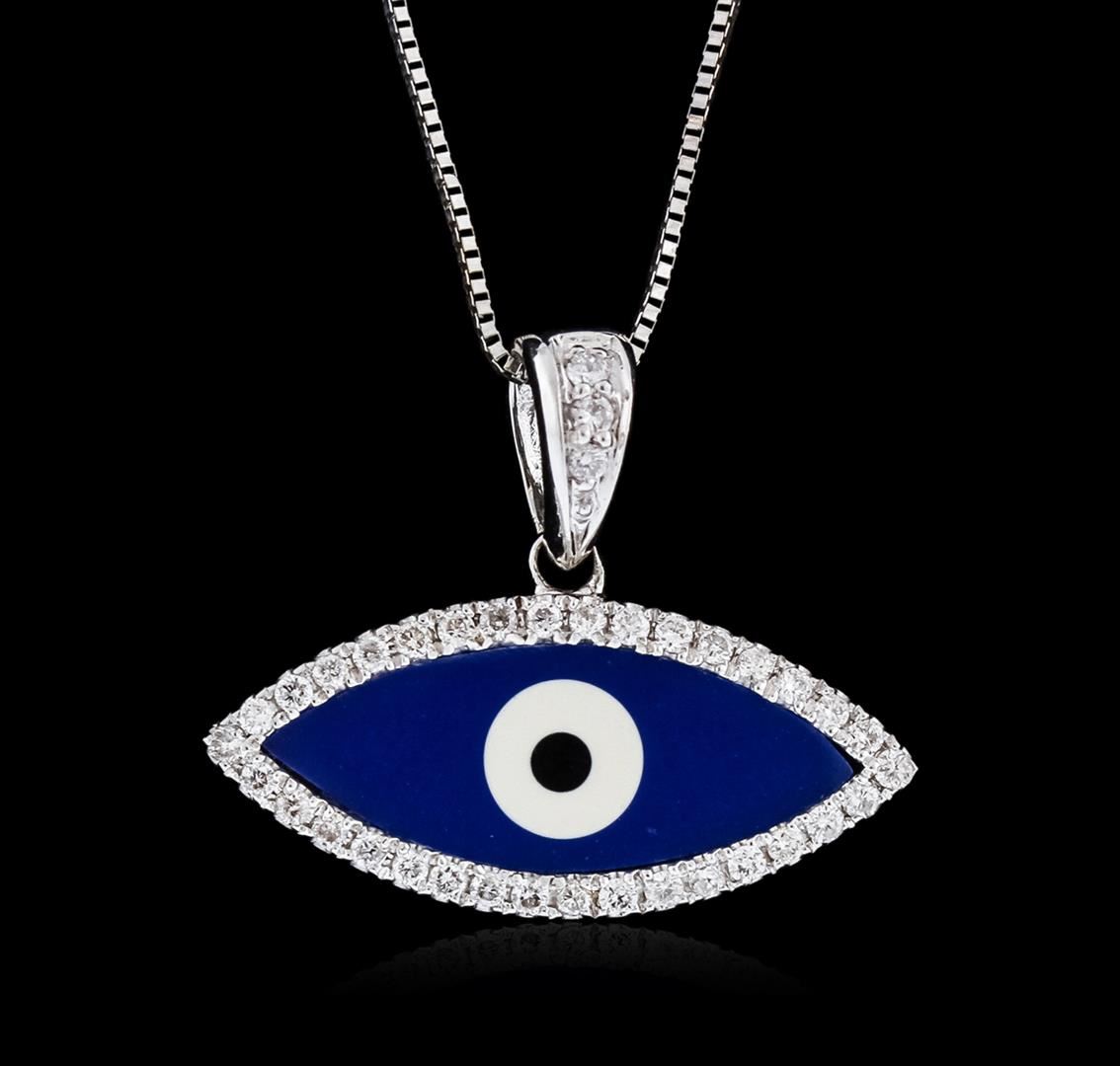 One evil eye pendant with chain featuring: 18KT white gold weighing 4.10 grams containing pave set round diamonds with a total weight of 0.20ct.