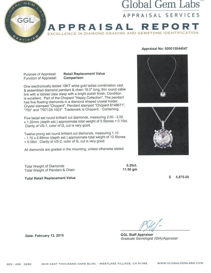 One electronically tested 18KT white gold ladies combination cast & assembled diamond pendant & chain 16.0" long, thin round cable link with a lobster claw clasp with a bright polish finish. Part of the Chopard "Happy Collection". The pendant has five floating diamonds in a diamond shaped crystal holder. Crystal stamped "Chopard". Pendant stamped "Chopard 6149671", "750" and "797135-1003" Trademark is Chopard. Condition is excellent. Containing: Five bezel set round brilliant cut diamonds, measuring 2.00 - 2.00 x 1.20mm (depth est.) approximate total weight of 5 Stones = 0.15ct. Clarity: VS-1. Color: G, Cut is Very Good. Twelve prong set round brilliant cut diamonds, measuring 1.10 - 1.10 x 0.66mm (depth est.) approximate total weight of 12 Stones = 0.06ct. Clarity: VS-2. Color: G, Cut is Very Good. All diamonds are graded in the mounting, unless otherwise stated. Total Weight of Diamonds 0.20ct. Total Weight of Pendant & Chain 11.50 grams. GGL Appraised at $5,875.00.