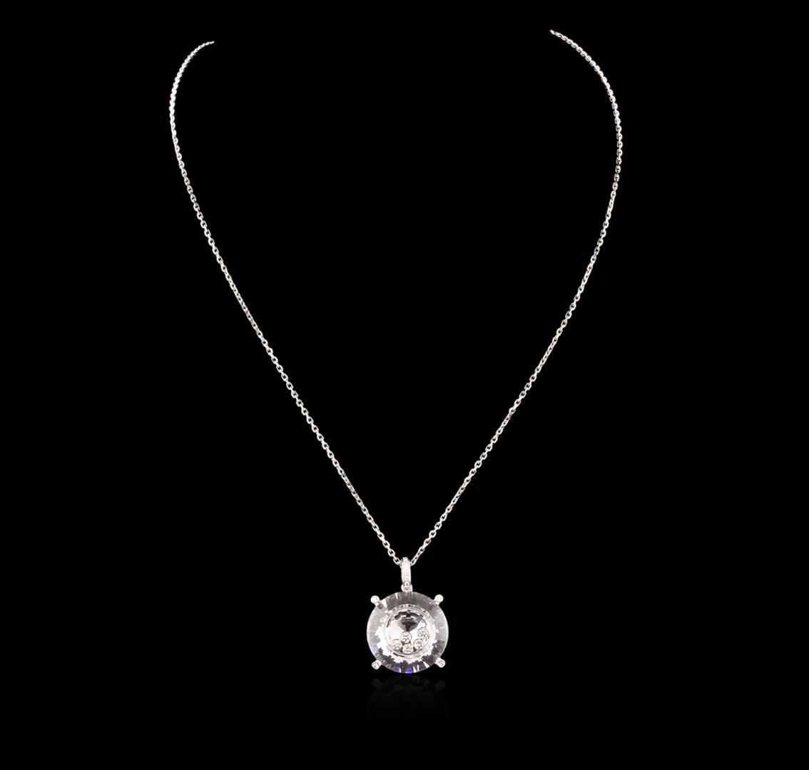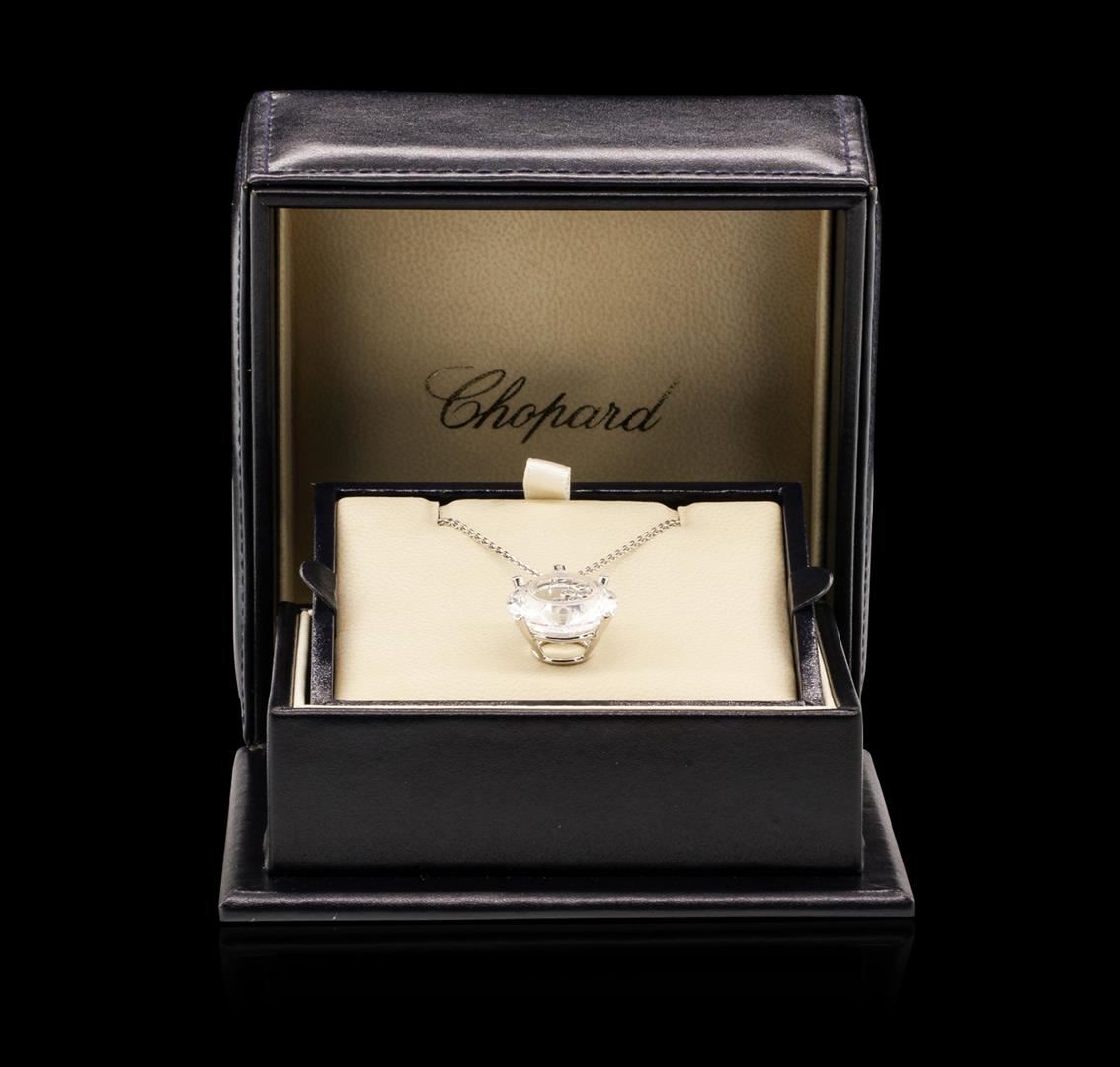 One electronically tested 18KT white gold ladies combination cast & assembled diamond pendant & chain 16.0" long, thin round cable link with a lobster claw clasp with a bright polish finish. Part of the Chopard "Happy Collection". The pendant has five floating diamonds in a diamond shaped crystal holder. Crystal stamped "Chopard". Pendant stamped "Chopard 6149671", "750" and "797135-1003" Trademark is Chopard. Condition is excellent. Containing: Five bezel set round brilliant cut diamonds, measuring 2.00 - 2.00 x 1.20mm (depth est.) approximate total weight of 5 Stones = 0.15ct. Clarity: VS-1. Color: G, Cut is Very Good. Twelve prong set round brilliant cut diamonds, measuring 1.10 - 1.10 x 0.66mm (depth est.) approximate total weight of 12 Stones = 0.06ct. Clarity: VS-2. Color: G, Cut is Very Good. All diamonds are graded in the mounting, unless otherwise stated. Total Weight of Diamonds 0.20ct. Total Weight of Pendant & Chain 11.50 grams. GGL Appraised at $5,875.00.