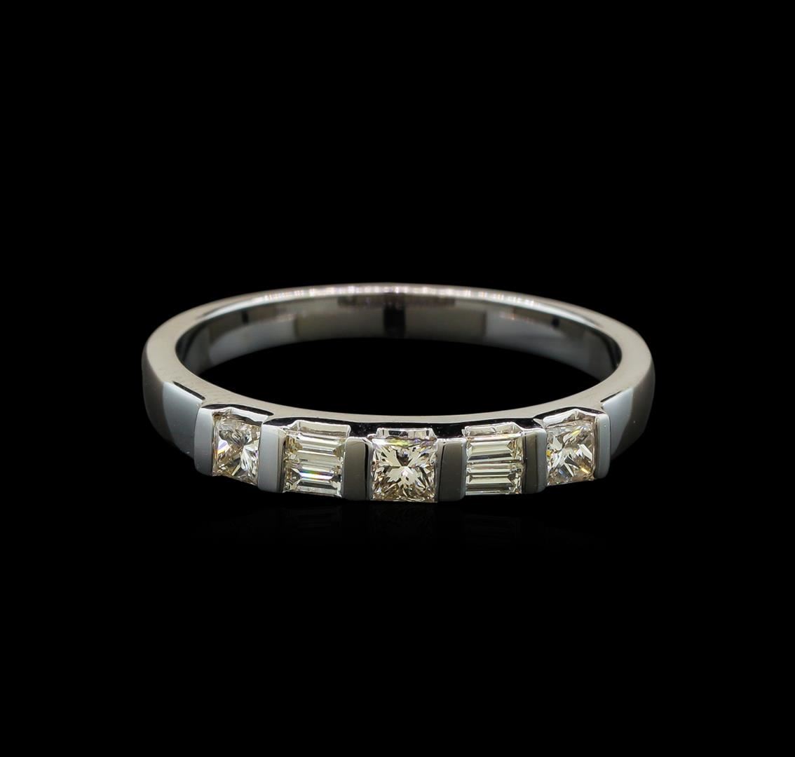 One electronically tested 18KT white gold ladies cast diamond ring with a flat shank with rounded edges with a bright polish finish. Identified with markings of "18K". Condition is new. Containing: Three prong set princess cut diamonds, measuring 2.50 x 2.50 x 1.88mm (depth est.) approximate total weight of 3 Stones = 0.29ct. Clarity: VS-2. Color: J, Cut is Good. Four channel set baguette cut diamonds, measuring 2.00 x 1.30 x 1.11mm (depth est.) approximate total weight of 4 Stones = 0.11ct. Clarity: VS-2. Color: I - J, Cut is Good. Diamonds are graded in the mounting, unless otherwise stated. Total Weight of Diamonds 0.40ct. Total Weight of Ring 3.10 grams. GGL Appraised at $1,640.00.