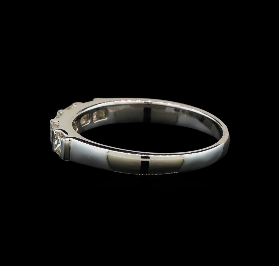 One electronically tested 18KT white gold ladies cast diamond ring with a flat shank with rounded edges with a bright polish finish. Identified with markings of "18K". Condition is new. Containing: Three prong set princess cut diamonds, measuring 2.50 x 2.50 x 1.88mm (depth est.) approximate total weight of 3 Stones = 0.29ct. Clarity: VS-2. Color: J, Cut is Good. Four channel set baguette cut diamonds, measuring 2.00 x 1.30 x 1.11mm (depth est.) approximate total weight of 4 Stones = 0.11ct. Clarity: VS-2. Color: I - J, Cut is Good. Diamonds are graded in the mounting, unless otherwise stated. Total Weight of Diamonds 0.40ct. Total Weight of Ring 3.10 grams. GGL Appraised at $1,640.00.