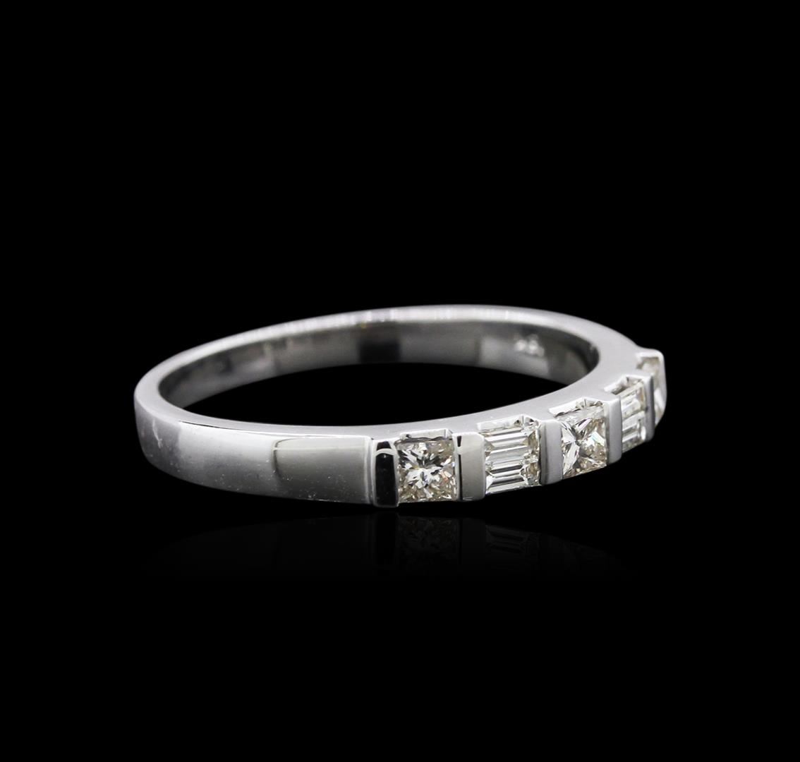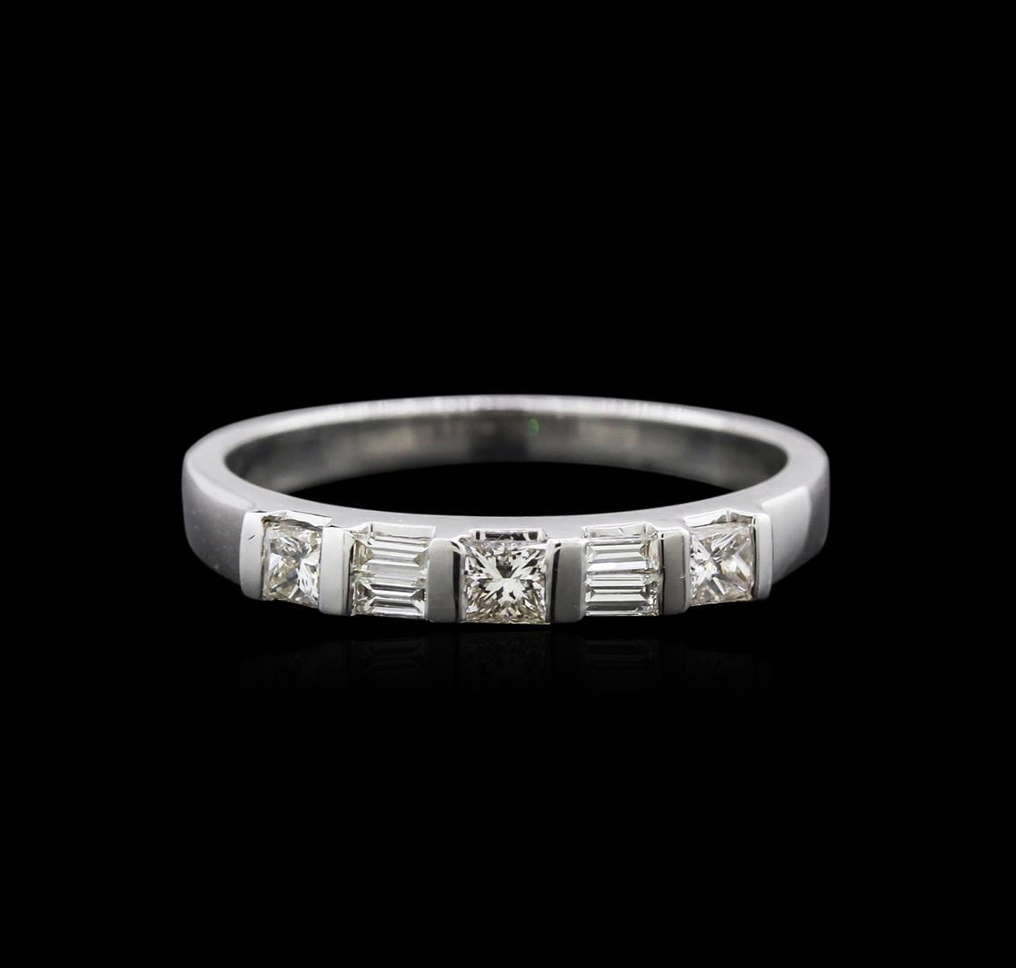 One electronically tested 18KT white gold ladies cast diamond ring with a flat shank with rounded edges with a bright polish finish. Identified with markings of "18K". Condition is new. Containing: Three prong set princess cut diamonds, measuring 2.50 x 2.50 x 1.88mm (depth est.) approximate total weight of 3 Stones = 0.29ct. Clarity: VS-2. Color: J, Cut is Good. Four channel set baguette cut diamonds, measuring 2.00 x 1.30 x 1.11mm (depth est.) approximate total weight of 4 Stones = 0.11ct. Clarity: VS-2. Color: I - J, Cut is Good. Diamonds are graded in the mounting, unless otherwise stated. Total Weight of Diamonds 0.40ct. Total Weight of Ring 3.10 grams. GGL Appraised at $1,640.00.