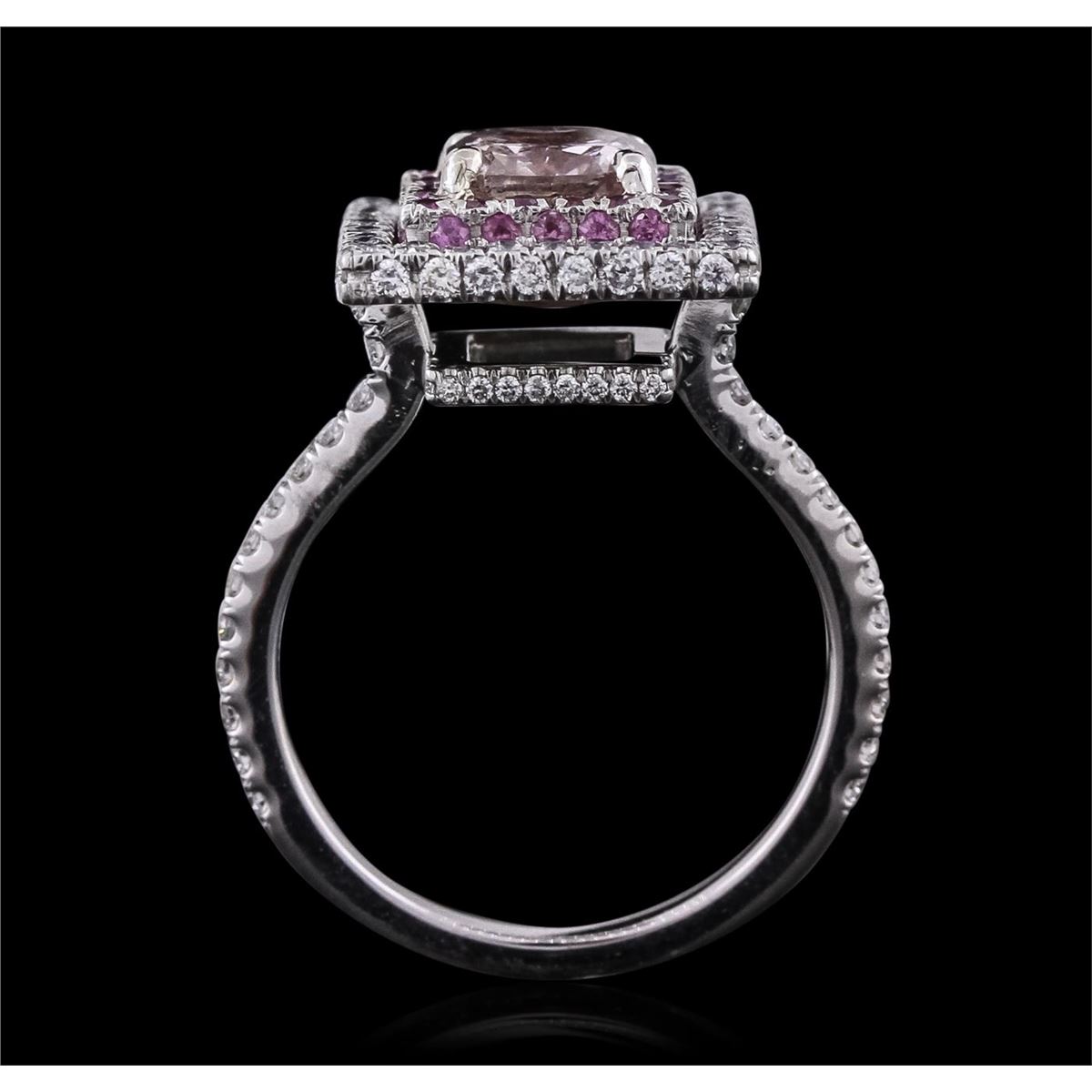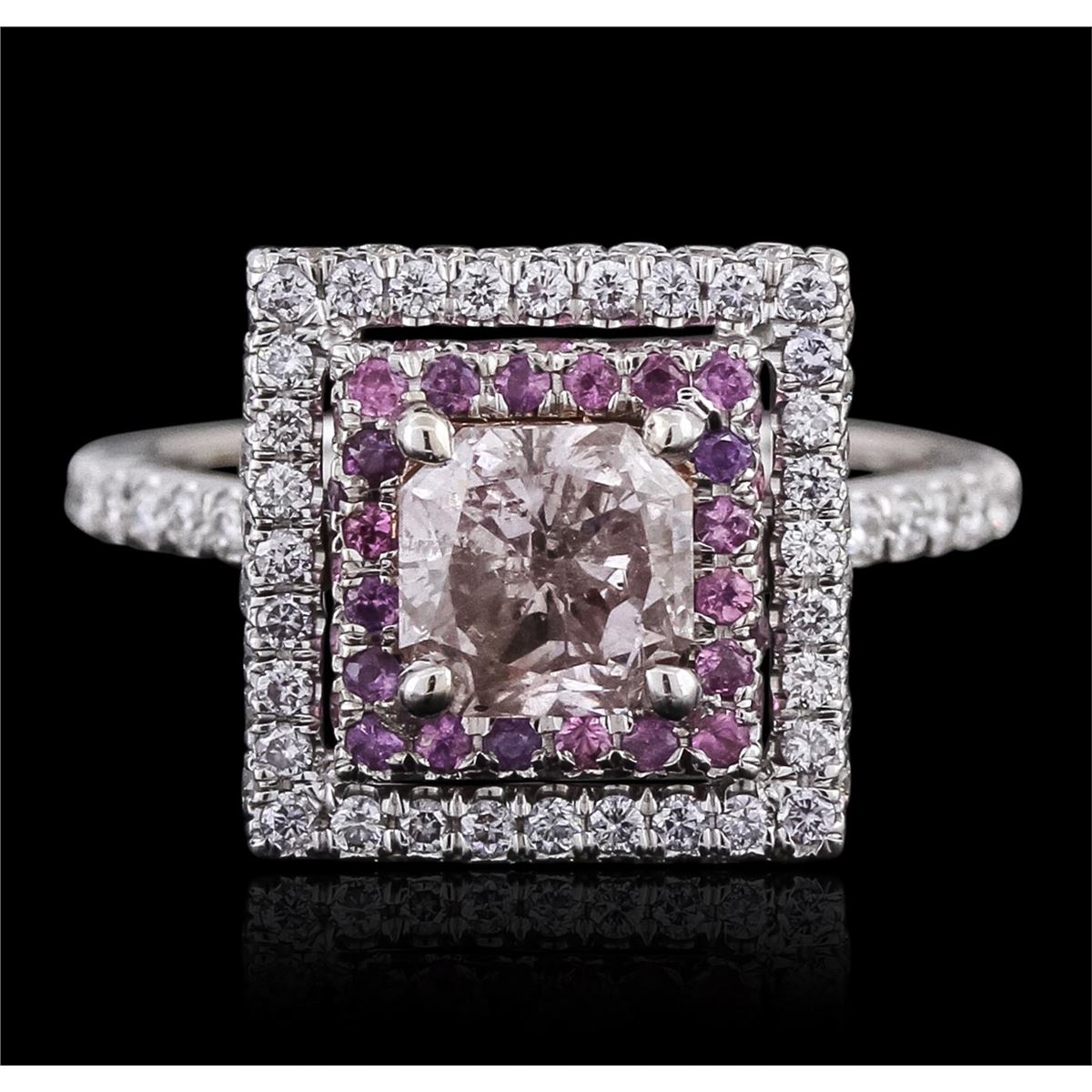 One electronically tested 18KT white gold ladies combination cast & assembled engagement ring with a bright polish finish. Condition is new. Identified with markings of "18K". Containing: One prong set radiant shaped cut diamond, measuring 5.75 x 5.74 x 3.86mm (depth est.) approximate weight of 1.03ct. Clarity: I-2, Color is Brownish Pink, Cut is Good. Graded loose prior to setting by GIA Gemological Laboratory GIA Report #1156979647. Clarity of the stone has been treated. One Hundred Fourteen prong set round brilliant cut diamonds, measuring 1.40 - 1.40 x 0.84mm (depth est.) approximate. Total Weight of 114 Stones = 1.14ct. Clarity: SI-2. Color: I - J, Cut is Good. Twenty prong set round modified brilliant cut natural purple sapphires, measuring 1.50 - 1.50 x 0.98 mm, approximate. Total Weight of 0.40ct., clarity is moderately included, type II, medium, moderately strong, purple color, (GIA P 5/4), cut is good. Colored gemstones are presumed to have been subjected to commonly used enhancement processes. All diamonds and colored gemstones are graded in the mounting, unless otherwise stated. Total Weight of Colored Stones 0.40ct. Total Weight of Diamonds 2.17ct. Total Weight of Ring 4.20 grams. GGL Appraised at $9,680.00.