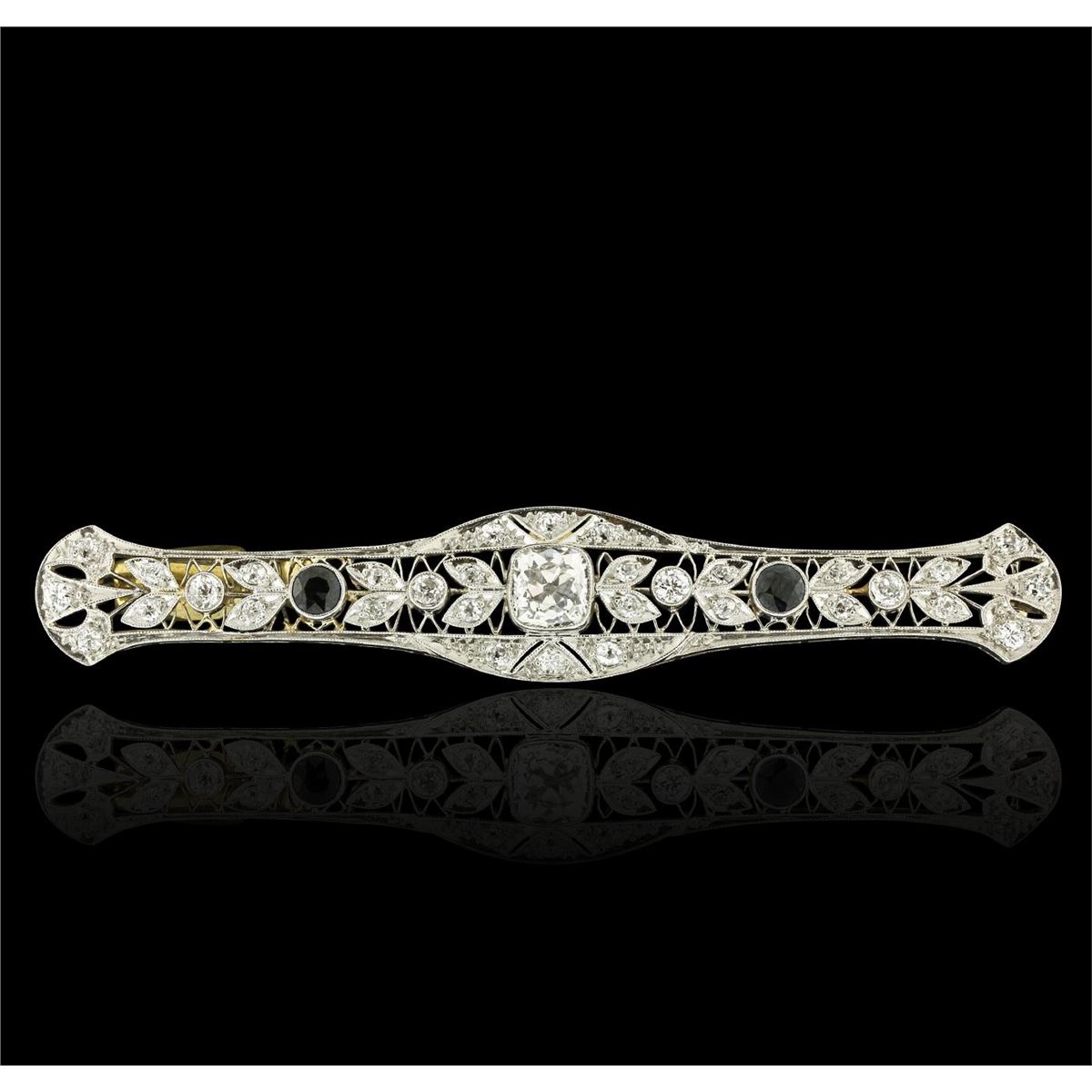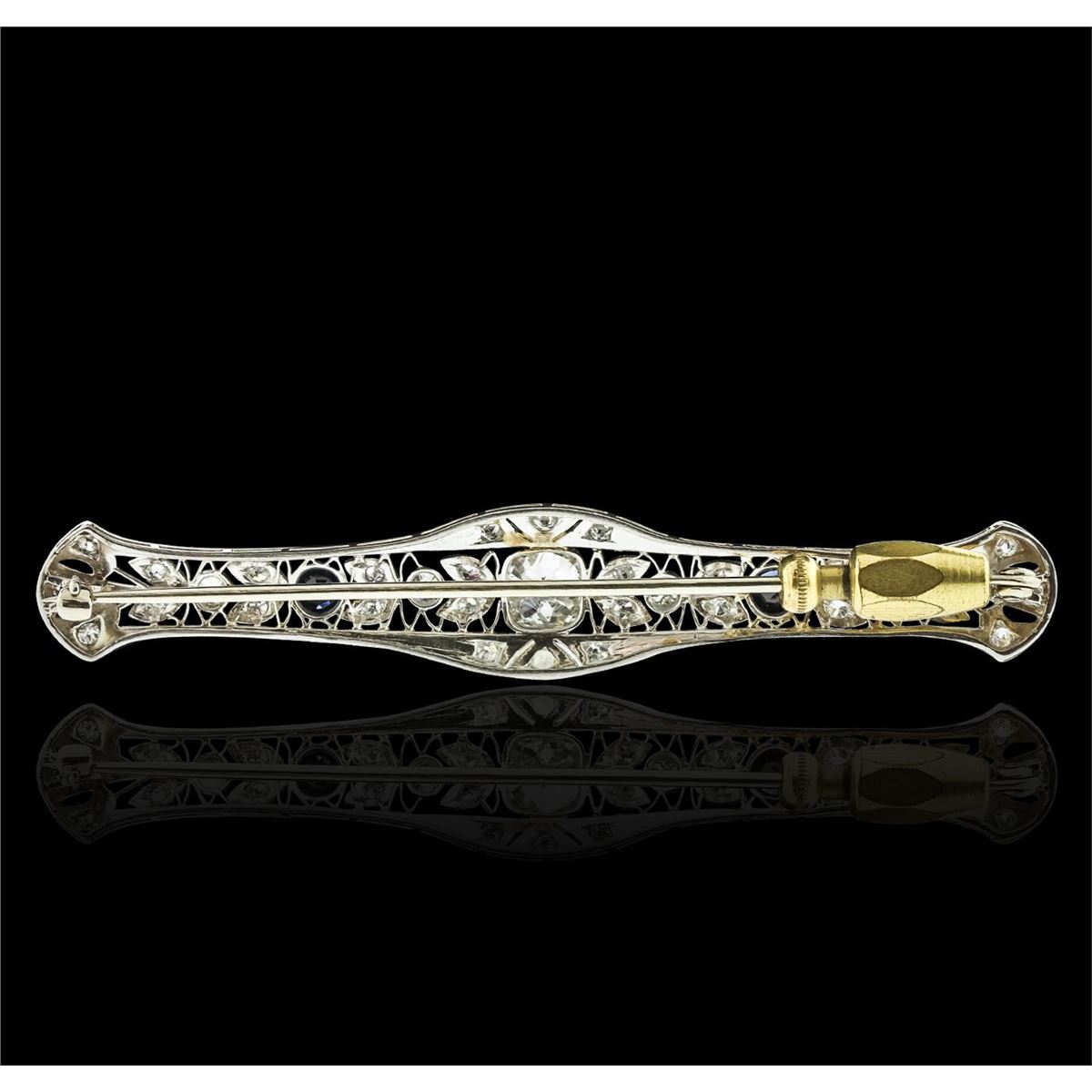 One electronically tested 18KT white gold ladies cast & assembled diamond and sapphire brooch. The brooch is completed by a horizontally placed pin. Bright polish finish with milgrain detailing throughout. Area measurements 3.00 x 0.50 inches. The brooch is reminiscent of the jewelry designs from the Art Deco Period. The Paris Exposition of Decorative Arts and Modern Manufacturers in 1925 gave the movement its name. The Art Deco Period is characterized with jewelry designs composed of bold geometric designs, & cubism. Condition is good. Containing: One bezel set cushion cut diamond, measuring 6.20 x 5.70 x 4.20mm (depth est.) approximate weight of 1.25ct. Cutting style circa early 20th century. Graded in the setting. Clarity: SI-1. Color: H Four bezel set Old European cut diamonds, measuring 2.80 - 2.70 x 1.80mm (depth est.) approximate total weight of 4 Stones = 0.40ct. Cutting style circa early and late 19th century. Graded in the setting. Clarity: SI-2 to I-1. Color: H - I Twenty-Eight bead set Old European cut diamonds, measuring 1.90 - 1.70 x 1.12mm (depth est.) approximate total weight of 28 Stones = 0.72ct. Cutting style circa early and late 19th century. Graded in the setting. Clarity: SI-1 to I-1. Color: H - I Two prong set round brilliant cut natural blue sapphires, measuring 3.80 - 3.70 x 2.20 mm, approximate total weight of 0.60ct., clarity is eye clean, type II, dark, very slightly grayish, very slightly greenish blue color, (GIA vslgB 7/3), cut is good. Transmitting light with no distortion, transparent. Color grade is an average for the pair. Graded in the setting. Total Weight of Colored Stones 0.60ct. Total Weight of Diamonds 2.37ct. Total Weight of Brooch 8.84 grams. AIG Appraised at $23,470.00.