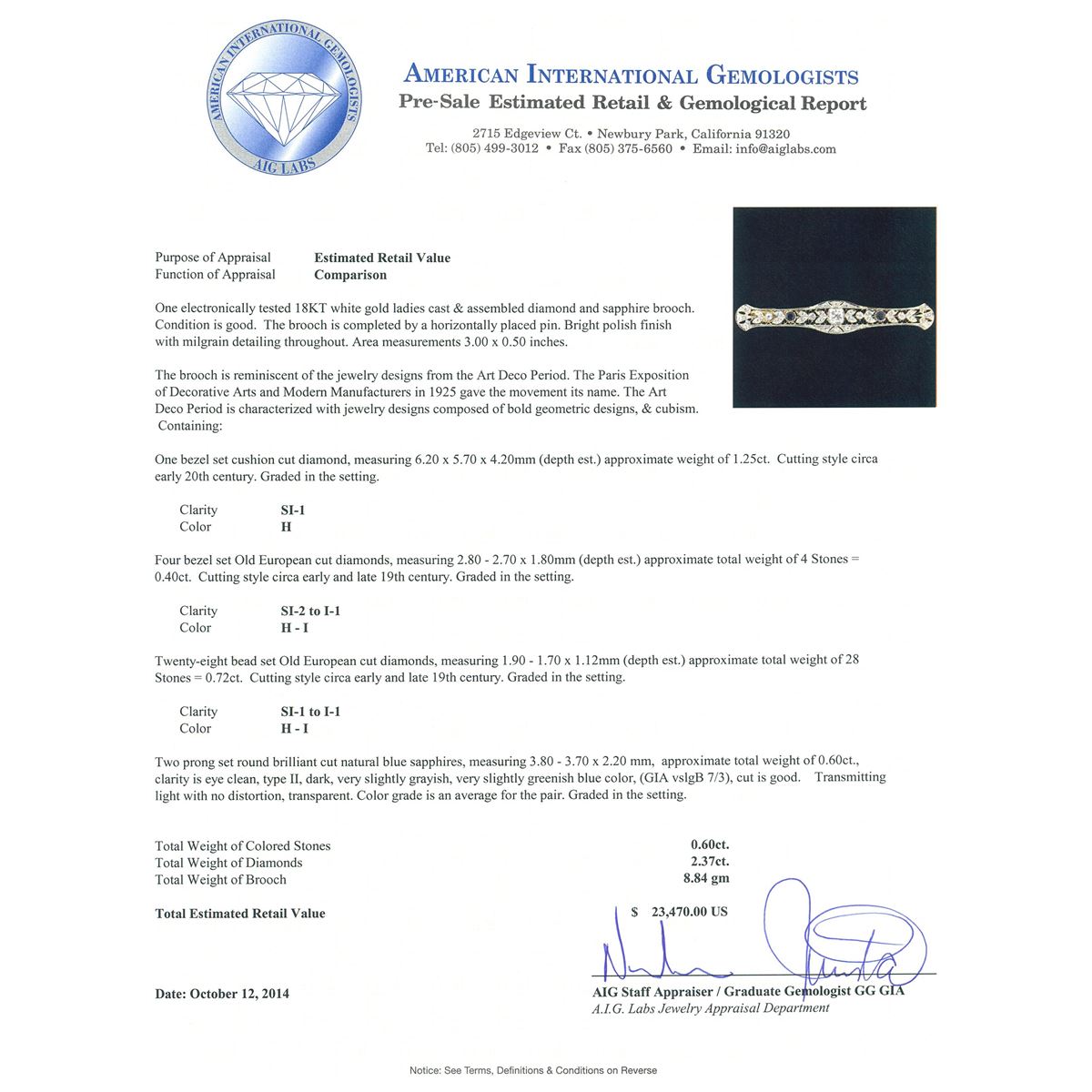 One electronically tested 18KT white gold ladies cast & assembled diamond and sapphire brooch. The brooch is completed by a horizontally placed pin. Bright polish finish with milgrain detailing throughout. Area measurements 3.00 x 0.50 inches. The brooch is reminiscent of the jewelry designs from the Art Deco Period. The Paris Exposition of Decorative Arts and Modern Manufacturers in 1925 gave the movement its name. The Art Deco Period is characterized with jewelry designs composed of bold geometric designs, & cubism. Condition is good. Containing: One bezel set cushion cut diamond, measuring 6.20 x 5.70 x 4.20mm (depth est.) approximate weight of 1.25ct. Cutting style circa early 20th century. Graded in the setting. Clarity: SI-1. Color: H Four bezel set Old European cut diamonds, measuring 2.80 - 2.70 x 1.80mm (depth est.) approximate total weight of 4 Stones = 0.40ct. Cutting style circa early and late 19th century. Graded in the setting. Clarity: SI-2 to I-1. Color: H - I Twenty-Eight bead set Old European cut diamonds, measuring 1.90 - 1.70 x 1.12mm (depth est.) approximate total weight of 28 Stones = 0.72ct. Cutting style circa early and late 19th century. Graded in the setting. Clarity: SI-1 to I-1. Color: H - I Two prong set round brilliant cut natural blue sapphires, measuring 3.80 - 3.70 x 2.20 mm, approximate total weight of 0.60ct., clarity is eye clean, type II, dark, very slightly grayish, very slightly greenish blue color, (GIA vslgB 7/3), cut is good. Transmitting light with no distortion, transparent. Color grade is an average for the pair. Graded in the setting. Total Weight of Colored Stones 0.60ct. Total Weight of Diamonds 2.37ct. Total Weight of Brooch 8.84 grams. AIG Appraised at $23,470.00.