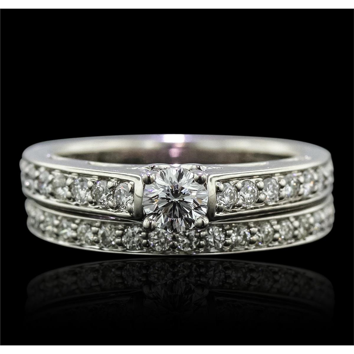 One electronically tested 18KT white gold Ladies cast engagement ring & wedding band with a bright polish finish. Condition is very good. Identified with markings of "18K". Containing: One prong set round brilliant cut diamond, measuring 4.30 - 4.20 x 2.55mm (depth est.) approximate weight of 0.28ct. Clarity: VS-2. Color: I, Cut is Very Good. Thirty-Four prong set round brilliant cut diamonds, measuring 1.50 - 1.50 x 0.90mm (depth est.) approximate. Total Weight of 34 Stones = 0.39ct. Clarity: SI-1 to SI-2. Color: I - J, Cut is Good. All grading of diamonds and colored gemstones are graded in the mounting, unless otherwise stated. Total Weight of Diamonds 0.67ct. Total Weight of 8.60 grams. GGL Appraised at $6,525.00.