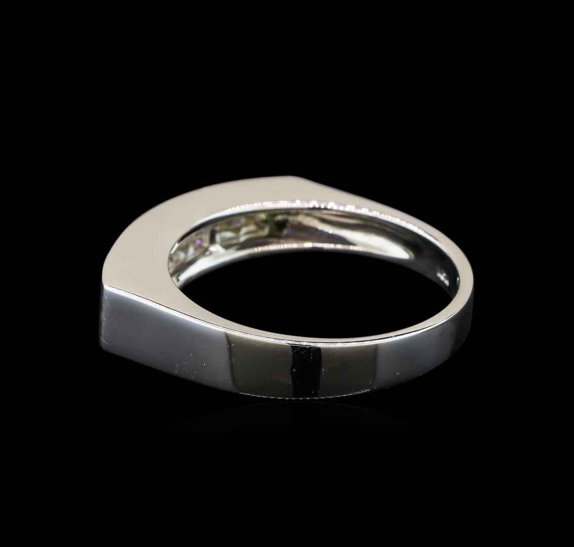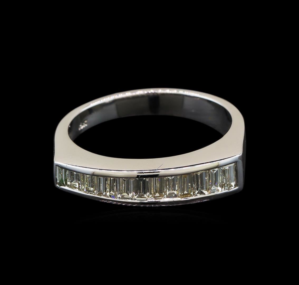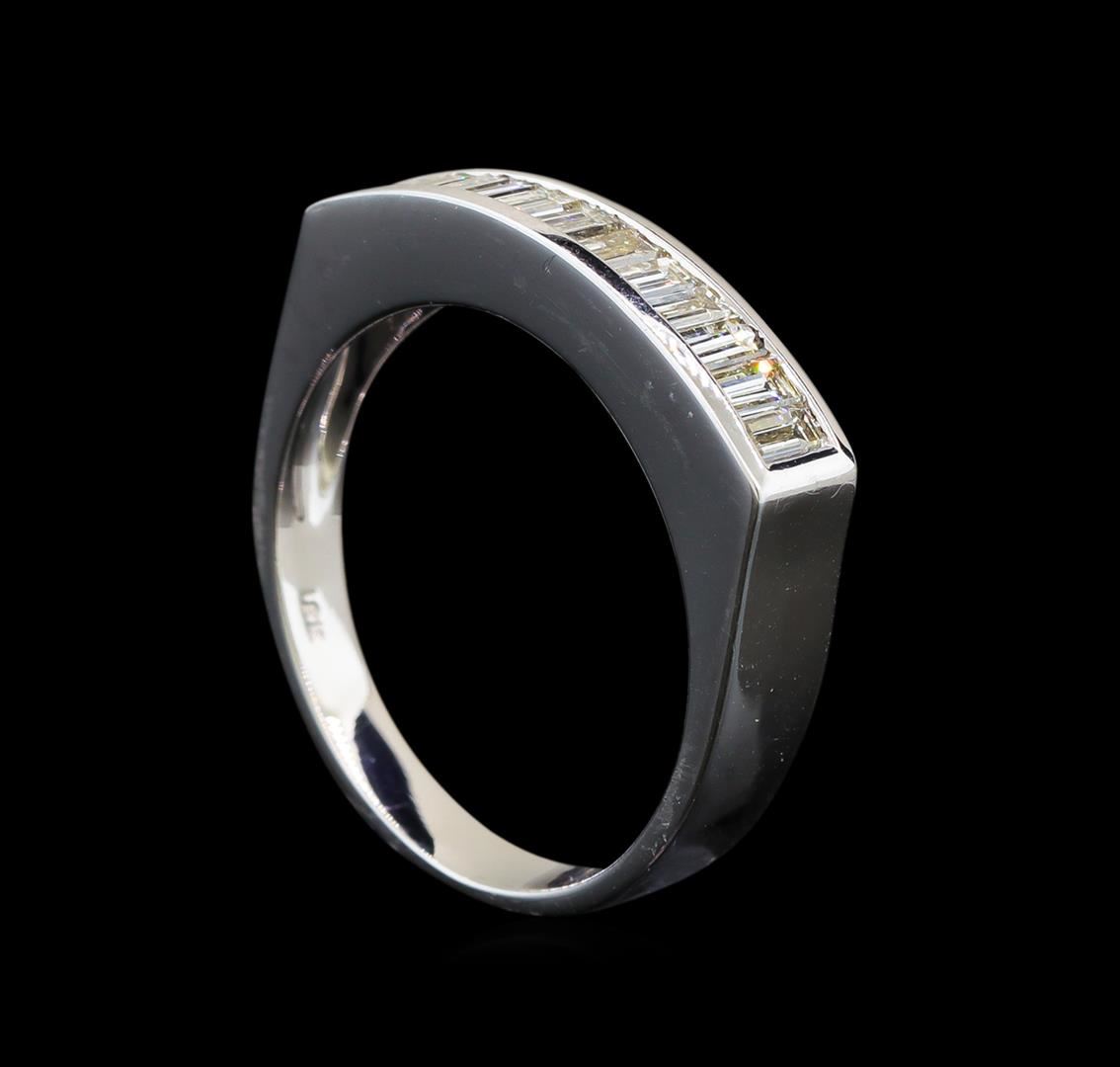 One electronically tested 18KT white gold ladies cast diamond ring with a bright polish finish. Identified with markings of "18K". Condition is new. Containing: Thirteen channel set baguette cut diamonds, measuring from 2.00 x 1.50 x 1.28mm (depth est.) to 3.00 x 1.80 x 1.53mm (depth est.) approximate total weight of 13 Stones = 0.69ct. Clarity: VS-2 to SI-1. Color: H - I, Cut is Good. All diamonds are graded in the mounting, unless otherwise stated. Total Weight of Diamonds 0.69ct. Total Weight of Ring 4.80 grams. GGL Appraised at $3,490.00.