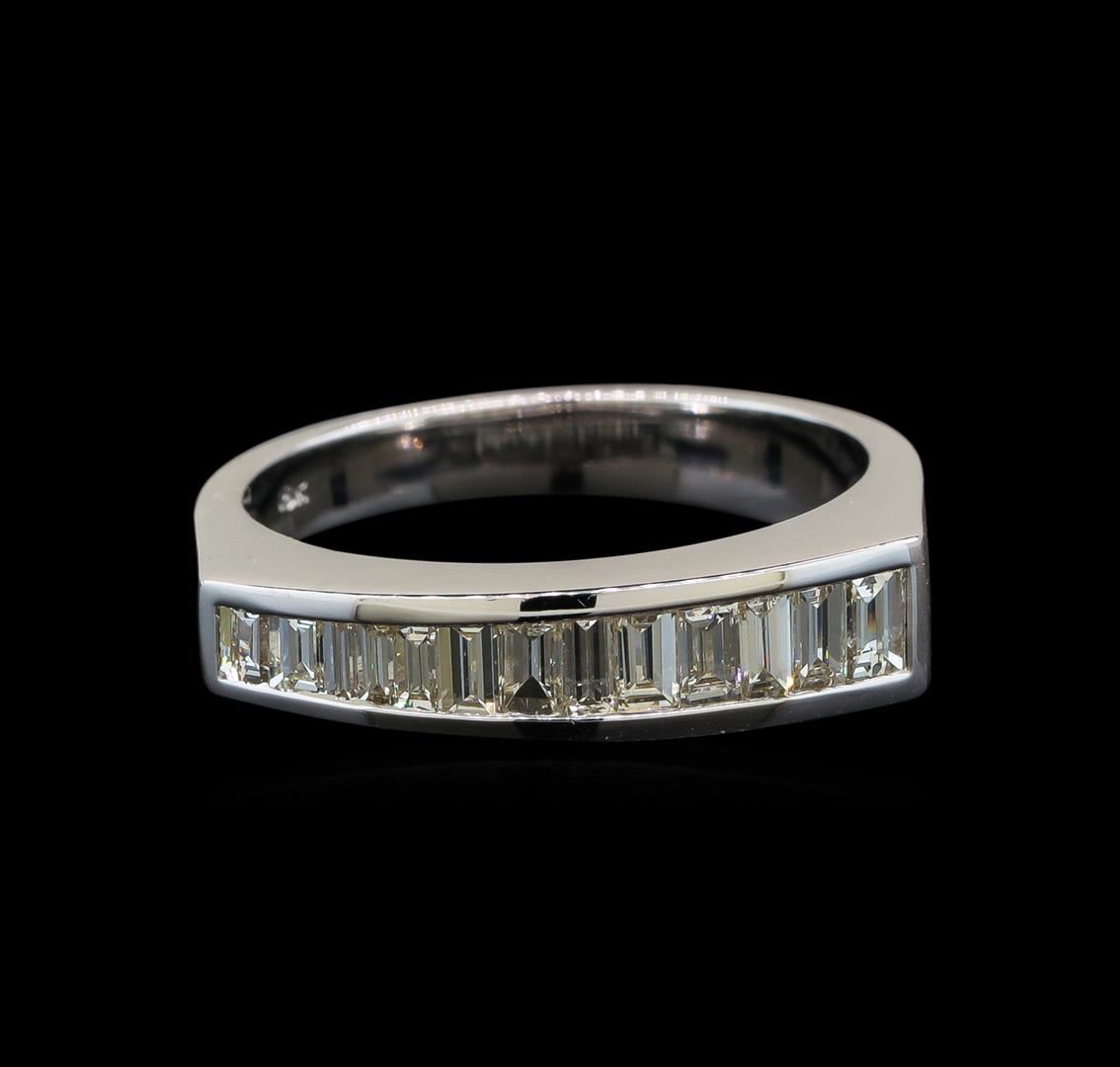 One electronically tested 18KT white gold ladies cast diamond ring with a bright polish finish. Identified with markings of "18K". Condition is new. Containing: Thirteen channel set baguette cut diamonds, measuring from 2.00 x 1.50 x 1.28mm (depth est.) to 3.00 x 1.80 x 1.53mm (depth est.) approximate total weight of 13 Stones = 0.69ct. Clarity: VS-2 to SI-1. Color: H - I, Cut is Good. All diamonds are graded in the mounting, unless otherwise stated. Total Weight of Diamonds 0.69ct. Total Weight of Ring 4.80 grams. GGL Appraised at $3,490.00.