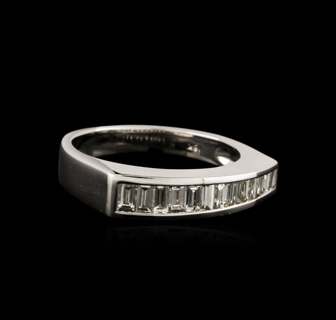 One electronically tested 18KT white gold ladies cast diamond ring with a bright polish finish. Identified with markings of "18K". Condition is new. Containing: Thirteen channel set baguette cut diamonds, measuring from 2.00 x 1.50 x 1.28mm (depth est.) to 3.00 x 1.80 x 1.53mm (depth est.) approximate total weight of 13 Stones = 0.69ct. Clarity: VS-2 to SI-1. Color: H - I, Cut is Good. All diamonds are graded in the mounting, unless otherwise stated. Total Weight of Diamonds 0.69ct. Total Weight of Ring 4.80 grams. GGL Appraised at $3,490.00.