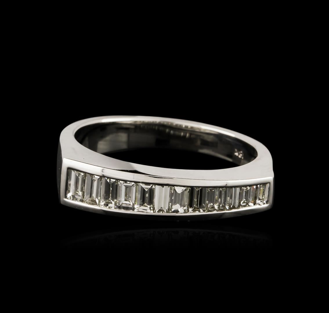 One electronically tested 18KT white gold ladies cast diamond ring with a bright polish finish. Identified with markings of "18K". Condition is new. Containing: Thirteen channel set baguette cut diamonds, measuring from 2.00 x 1.50 x 1.28mm (depth est.) to 3.00 x 1.80 x 1.53mm (depth est.) approximate total weight of 13 Stones = 0.69ct. Clarity: VS-2 to SI-1. Color: H - I, Cut is Good. All diamonds are graded in the mounting, unless otherwise stated. Total Weight of Diamonds 0.69ct. Total Weight of Ring 4.80 grams. GGL Appraised at $3,490.00.