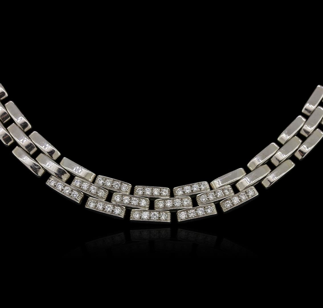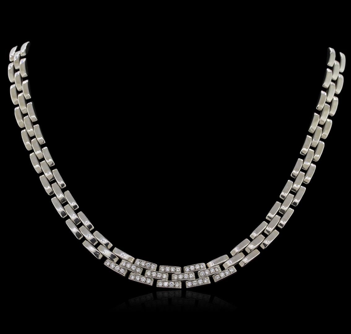 One electronically tested 18KT white gold ladies cast diamond necklace with a hidden box clasp with a bright polish finish. Measurements: 16" in length Identified with markings of "750". Condition is very good. Containing: Forty-Eight prong set round brilliant cut diamonds, measuring 1.60 - 1.60 x 0.96mm (depth est.) approximate total weight of 48 Stones = 0.72ct. Clarity: VS-2 to SI-1. Color: G - H, Cut is Good. All diamonds are graded in the mounting, unless otherwise stated. Total Weight of Diamonds 0.72ct. Total Weight of Necklace 73.20 grams. GGL Appraised at $22,705.00.