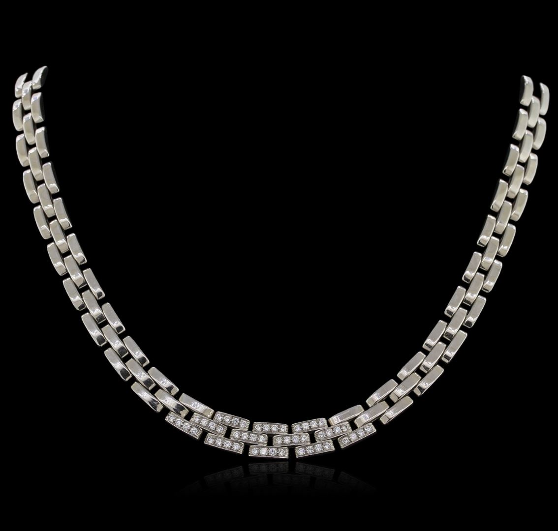 One electronically tested 18KT white gold ladies cast diamond necklace with a hidden box clasp with a bright polish finish. Measurements: 16" in length Identified with markings of "750". Condition is very good. Containing: Forty-Eight prong set round brilliant cut diamonds, measuring 1.60 - 1.60 x 0.96mm (depth est.) approximate total weight of 48 Stones = 0.72ct. Clarity: VS-2 to SI-1. Color: G - H, Cut is Good. All diamonds are graded in the mounting, unless otherwise stated. Total Weight of Diamonds 0.72ct. Total Weight of Necklace 73.20 grams. GGL Appraised at $22,705.00.