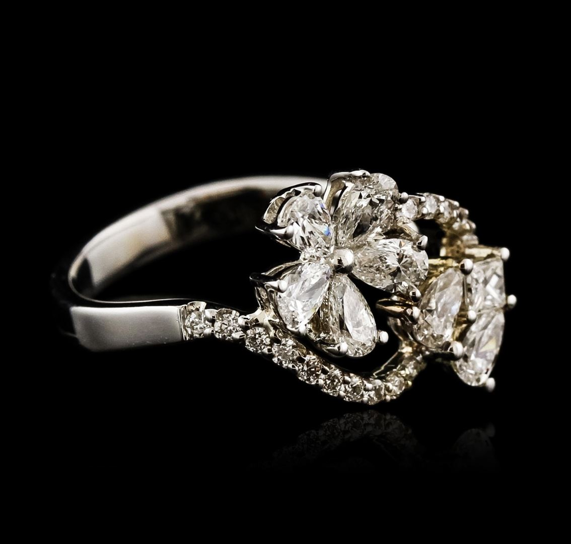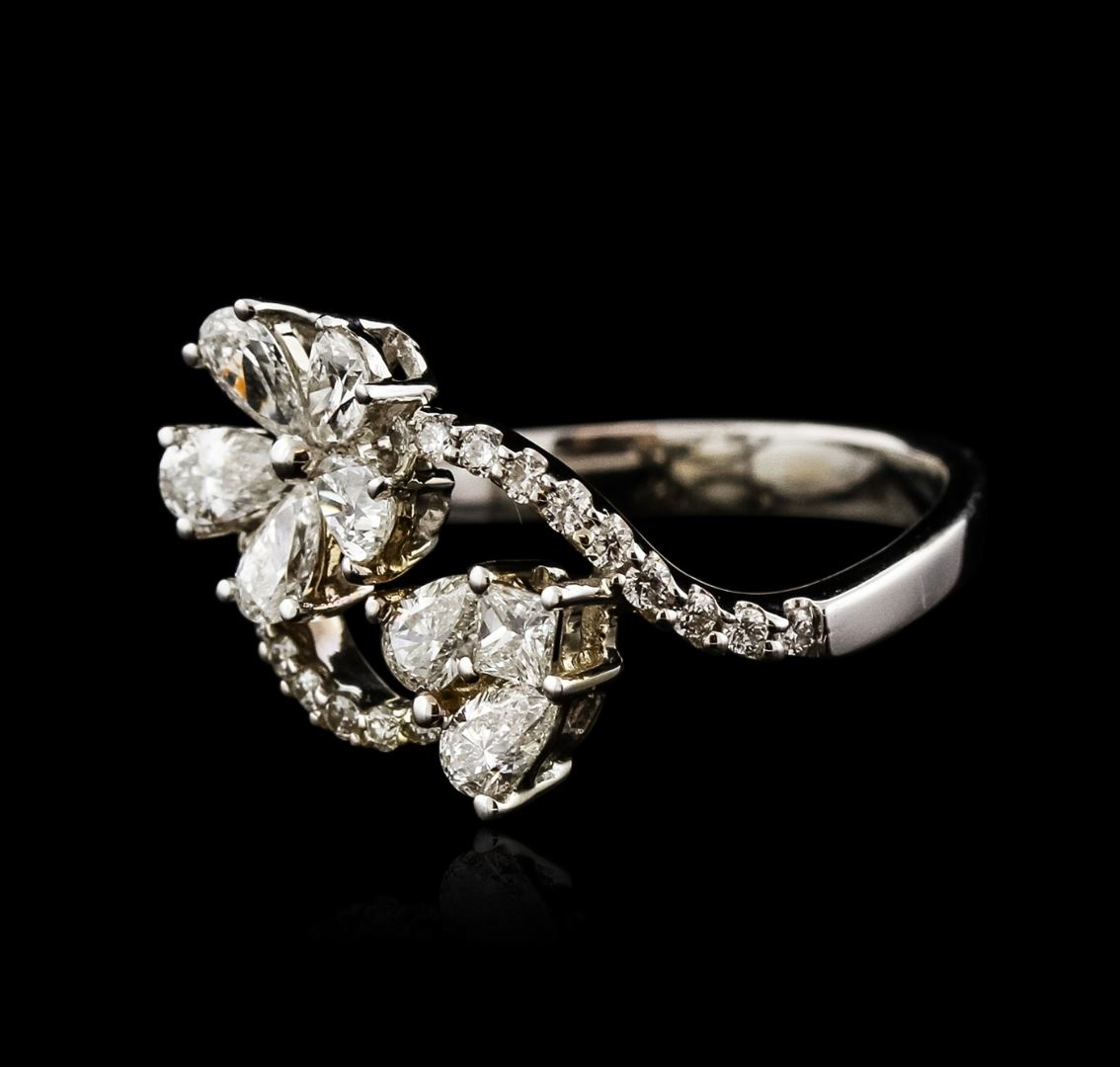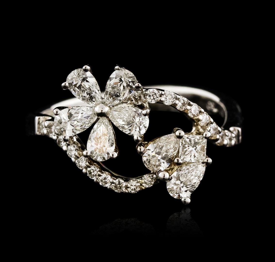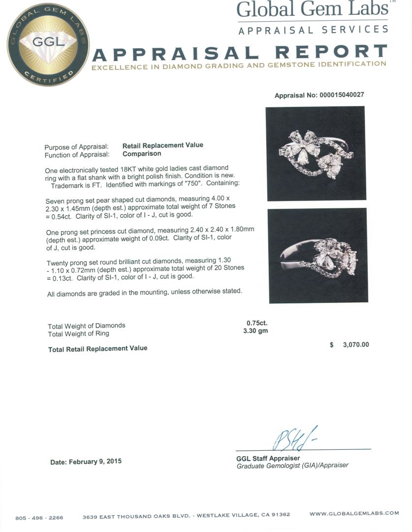One electronically tested 18KT white gold ladies cast diamond ring with a flat shank with a bright polish finish. Trademark is FT. Identified with markings of "750". Condition is new. Containing: Seven prong set pear shaped cut diamonds, measuring 4.00 x 2.30 x 1.45mm (depth est.) approximate total weight of 7 Stones = 0.54ct. Clarity: SI-1. Color: I - J, Cut is Good. One prong set princess cut diamond, measuring 2.40 x 2.40 x 1.80mm (depth est.) approximate weight of 0.09ct. Clarity: SI-1. Color: J, Cut is Good. Twenty prong set round brilliant cut diamonds, measuring 1.30 - 1.10 x 0.72mm (depth est.) approximate total weight of 20 Stones = 0.13ct. Clarity: SI-1. Color: I - J, Cut is Good. All diamonds are graded in the mounting, unless otherwise stated. Total Weight of Diamonds 0.75ct. Total Weight of Ring 3.30 grams. GGL Appraised at $3,070.00.
