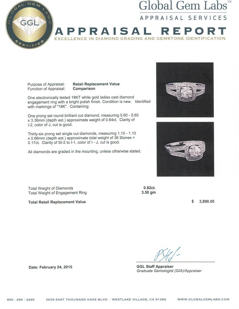 One electronically tested 18KT white gold ladies cast diamond engagement ring with a bright polish finish. Identified with markings of "18K". Condition is new. Containing: One prong set round brilliant cut diamond, measuring 5.60 - 5.60 x 3.36mm (depth est.) approximate weight of 0.64ct. Clarity: I-2. Color: J, Cut is Good. Thirty-Six prong set single cut diamonds, measuring 1.10 - 1.10 x 0.66mm (depth est.) approximate total weight of 36 Stones = 0.17ct. Clarity: SI-2 to I-1. Color: I - J, Cut is Good. All diamonds are graded in the mounting, unless otherwise stated. Total Weight of Diamonds 0.82ct. Total Weight of Engagement Ring 3.50 grams. GGL Appraised at $3,890.00.