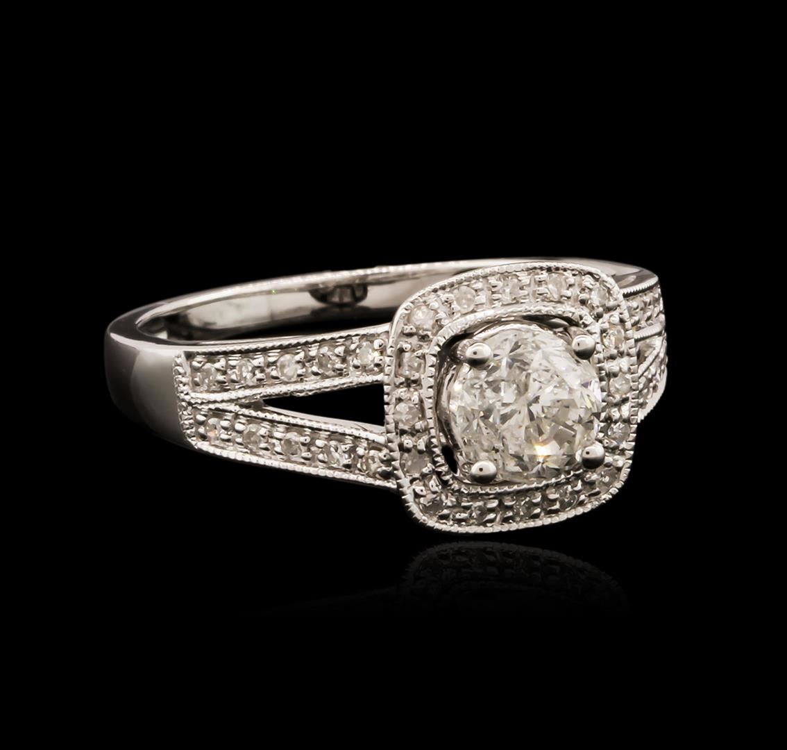 One electronically tested 18KT white gold ladies cast diamond engagement ring with a bright polish finish. Identified with markings of "18K". Condition is new. Containing: One prong set round brilliant cut diamond, measuring 5.60 - 5.60 x 3.36mm (depth est.) approximate weight of 0.64ct. Clarity: I-2. Color: J, Cut is Good. Thirty-Six prong set single cut diamonds, measuring 1.10 - 1.10 x 0.66mm (depth est.) approximate total weight of 36 Stones = 0.17ct. Clarity: SI-2 to I-1. Color: I - J, Cut is Good. All diamonds are graded in the mounting, unless otherwise stated. Total Weight of Diamonds 0.82ct. Total Weight of Engagement Ring 3.50 grams. GGL Appraised at $3,890.00.