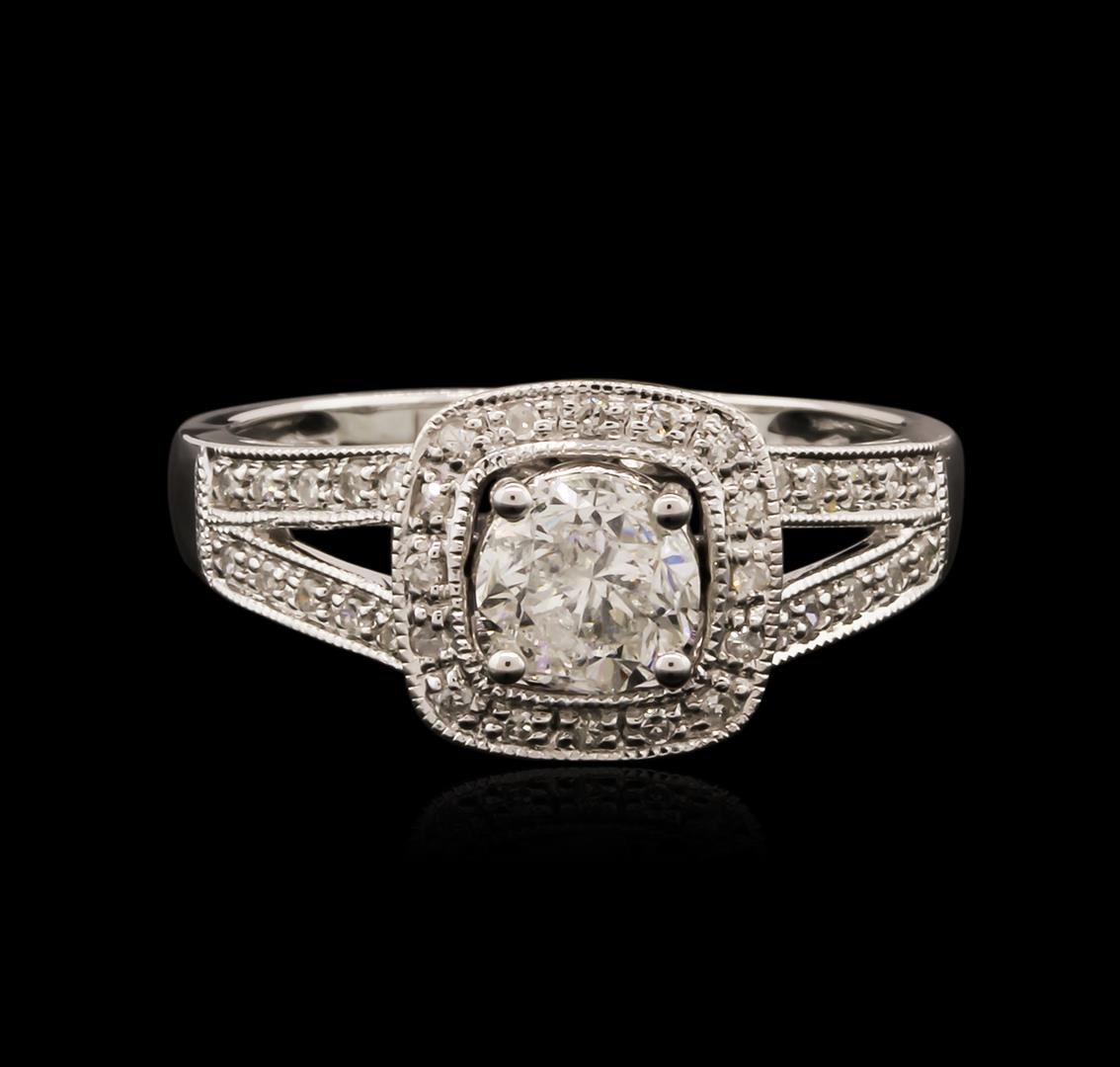 One electronically tested 18KT white gold ladies cast diamond engagement ring with a bright polish finish. Identified with markings of "18K". Condition is new. Containing: One prong set round brilliant cut diamond, measuring 5.60 - 5.60 x 3.36mm (depth est.) approximate weight of 0.64ct. Clarity: I-2. Color: J, Cut is Good. Thirty-Six prong set single cut diamonds, measuring 1.10 - 1.10 x 0.66mm (depth est.) approximate total weight of 36 Stones = 0.17ct. Clarity: SI-2 to I-1. Color: I - J, Cut is Good. All diamonds are graded in the mounting, unless otherwise stated. Total Weight of Diamonds 0.82ct. Total Weight of Engagement Ring 3.50 grams. GGL Appraised at $3,890.00.