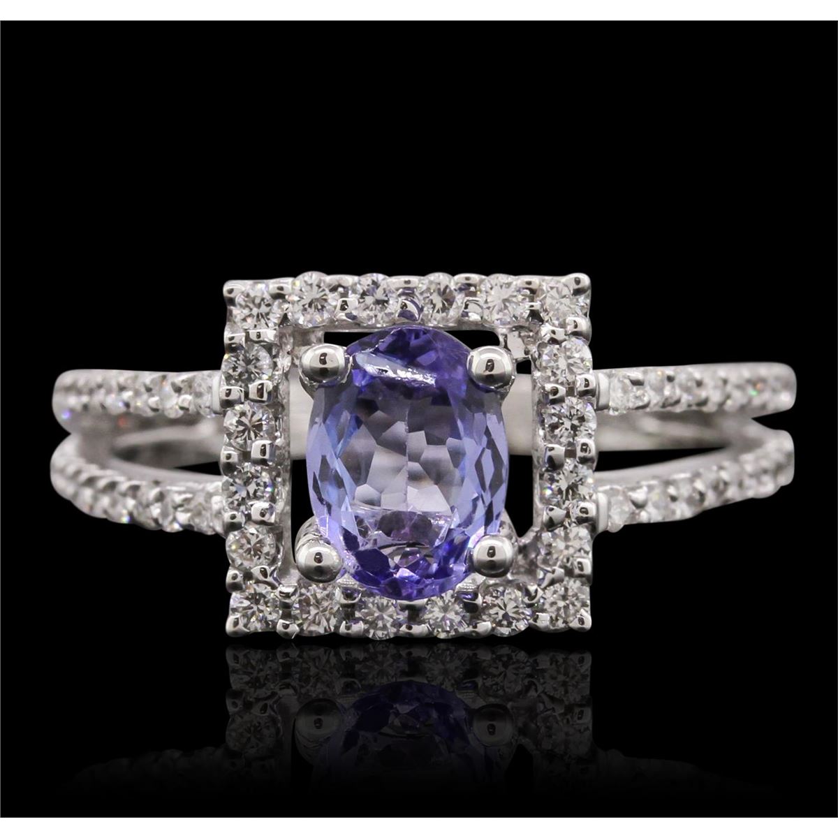 One electronically tested 18KT white gold Ladies combination cast & assembled ring with a bright polish finish. Condition is new. Identified with markings of "18K". Containing: One prong set oval modified brilliant cut natural tanzanite, measuring 7.50 x 5.60 x 2.90mm, approximate weight of 0.83ct., clarity is eye clean, type I, medium light, very slightly grayish, violet color, (GIA V 4/3), cut is good. Colored gemstones are presumed to have been subjected to commonly used color/clarity enhancement processes. Seventy-Six prong set round brilliant cut diamonds, measuring 1.30 - 1.30 x 0.78mm (depth est.) approximate. Total Weight of 76 Stones = 0.61ct. Clarity: I-1 to I-2. Color: I - J, Cut is Good. Total Weight of Colored Stones 0.83ct. Total Weight of Diamonds 0.61ct. Total Weight of Ring 4.80 grams. GGL Appraised at $4,840.00.