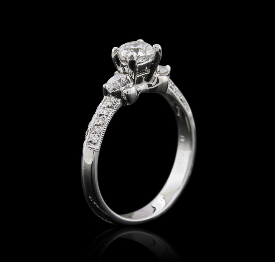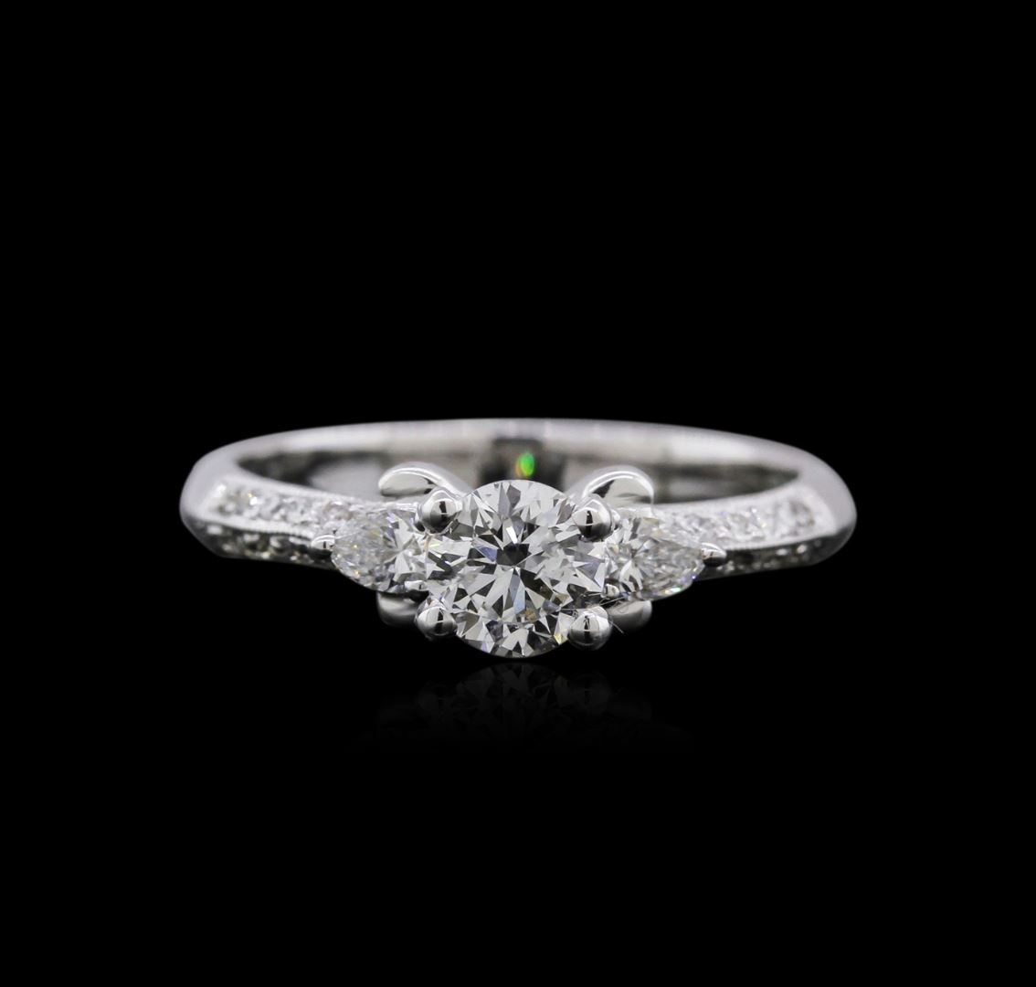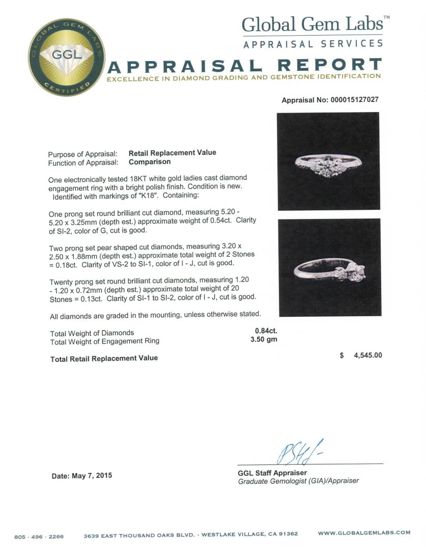 One electronically tested 18KT white gold ladies cast diamond engagement ring with a bright polish finish. Identified with markings of "K18". Condition is new. Containing: One prong set round brilliant cut diamond, measuring 5.20 - 5.20 x 3.25mm (depth est.) approximate weight of 0.54ct. Clarity: SI-2. Color: G, Cut is Good. Two prong set pear shaped cut diamonds, measuring 3.20 x 2.50 x 1.88mm (depth est.) approximate total weight of 2 Stones = 0.18ct. Clarity: VS-2 to SI-1. Color: I - J, Cut is Good. Twenty prong set round brilliant cut diamonds, measuring 1.20 - 1.20 x 0.72mm (depth est.) approximate total weight of 20 Stones = 0.13ct. Clarity: SI-1 to SI-2. Color: I - J, Cut is Good. All diamonds are graded in the mounting, unless otherwise stated. Total Weight of Diamonds 0.84ct. Total Weight of Engagement Ring 3.50 grams. GGL Appraised at $4,545.00.