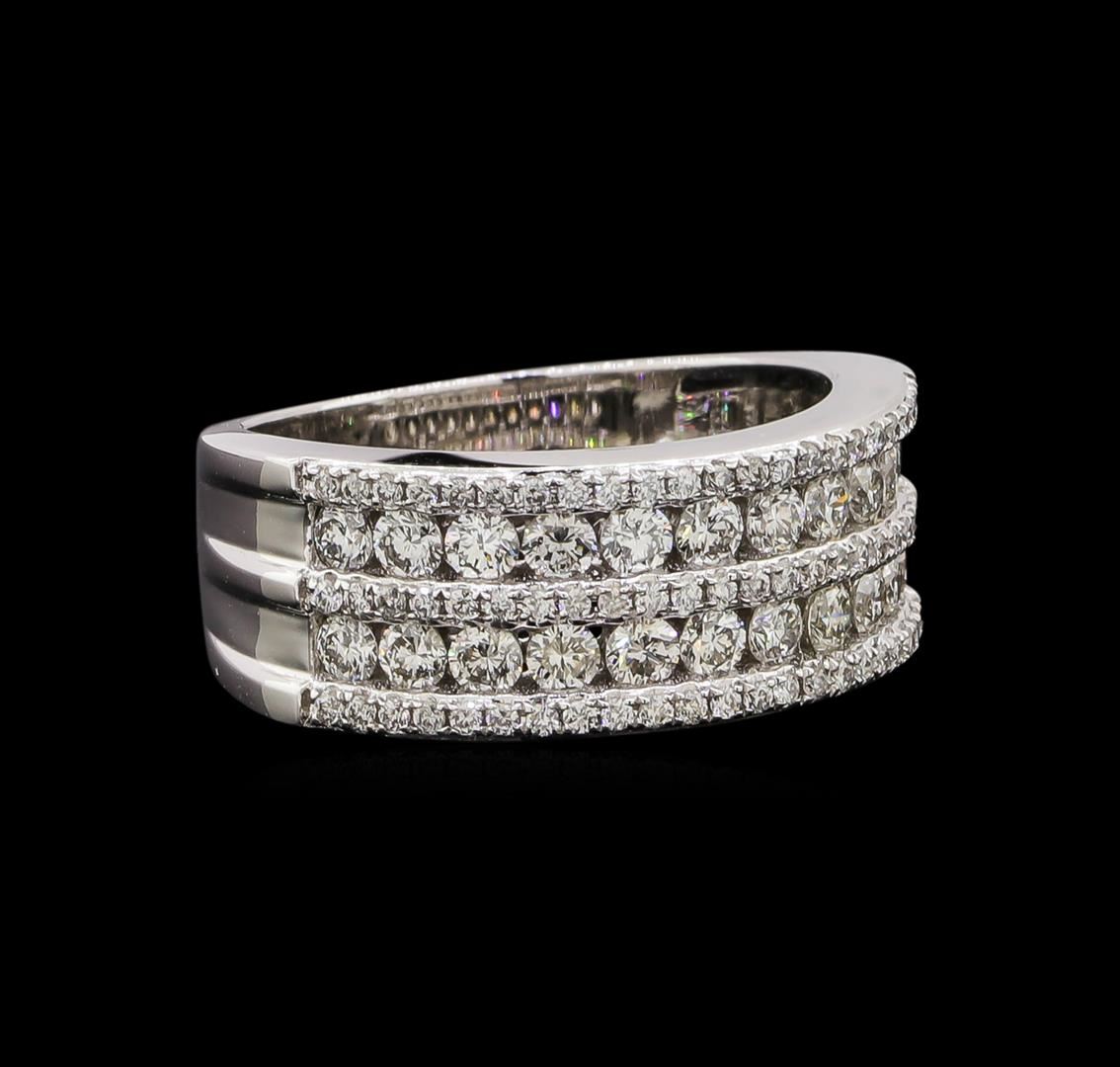 One electronically tested 18KT white gold ladies cast diamond ring with a bright polish finish. Identified with markings of "750". Condition is new. Containing: Twenty-Two channel set round brilliant cut diamonds, measuring 2.00 - 2.00 x 1.20mm (depth est.) approximate total weight of 22 Stones = 0.64ct. Clarity: SI-1 to I-1. Color: I - J, Cut is Good. Seventy-Five prong set round brilliant cut diamonds, measuring 1.00 - 1.00 x 0.60mm (depth est.) approximate total weight of 75 Stones = 0.27ct. Clarity: SI-1 to I-1. Color: I - J, Cut is Good. All diamonds are graded in the mounting, unless otherwise stated. Total Weight of Diamonds 0.91ct. Total Weight of Ring 6.40 grams. GGL Appraised at $4,070.00.