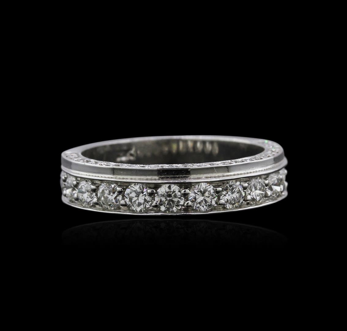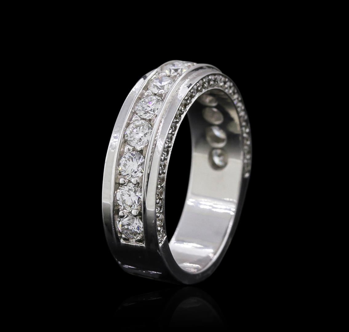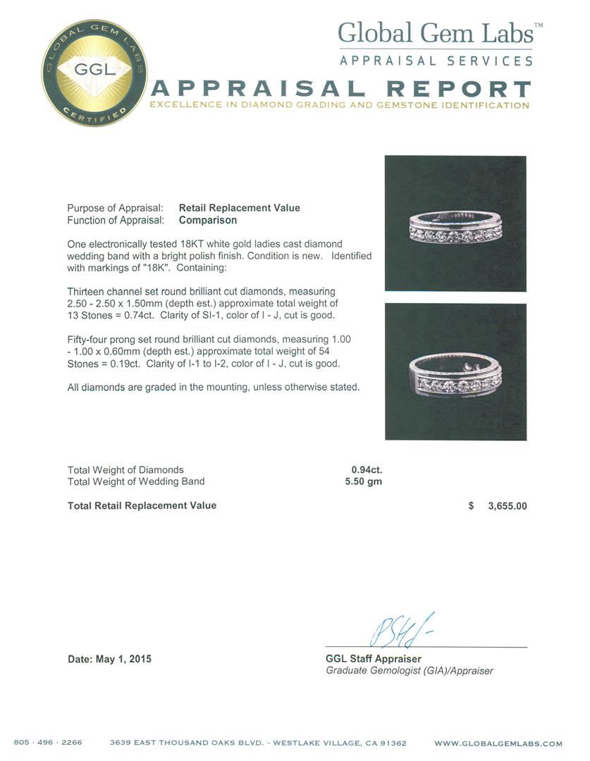 One electronically tested 18KT white gold ladies cast diamond wedding band with a bright polish finish. Identified with markings of "18K". Condition is new. Containing: Thirteen channel set round brilliant cut diamonds, measuring 2.50 - 2.50 x 1.50mm (depth est.) approximate. Total Weight of 13 Stones = 0.74ct. Clarity: SI-1. Color: I - J, Cut is Good. Fifty-Four prong set round brilliant cut diamonds, measuring 1.00 - 1.00 x 0.60mm (depth est.) approximate. Total Weight of 54 Stones = 0.19ct. Clarity: I-1 to I-2. Color: I - J, Cut is Good. All diamonds are graded in the mounting, unless otherwise stated. Total Weight of Diamonds 0.94ct. Total Weight of Wedding Band 5.50 grams. GGL Appraised at $3,655.00.