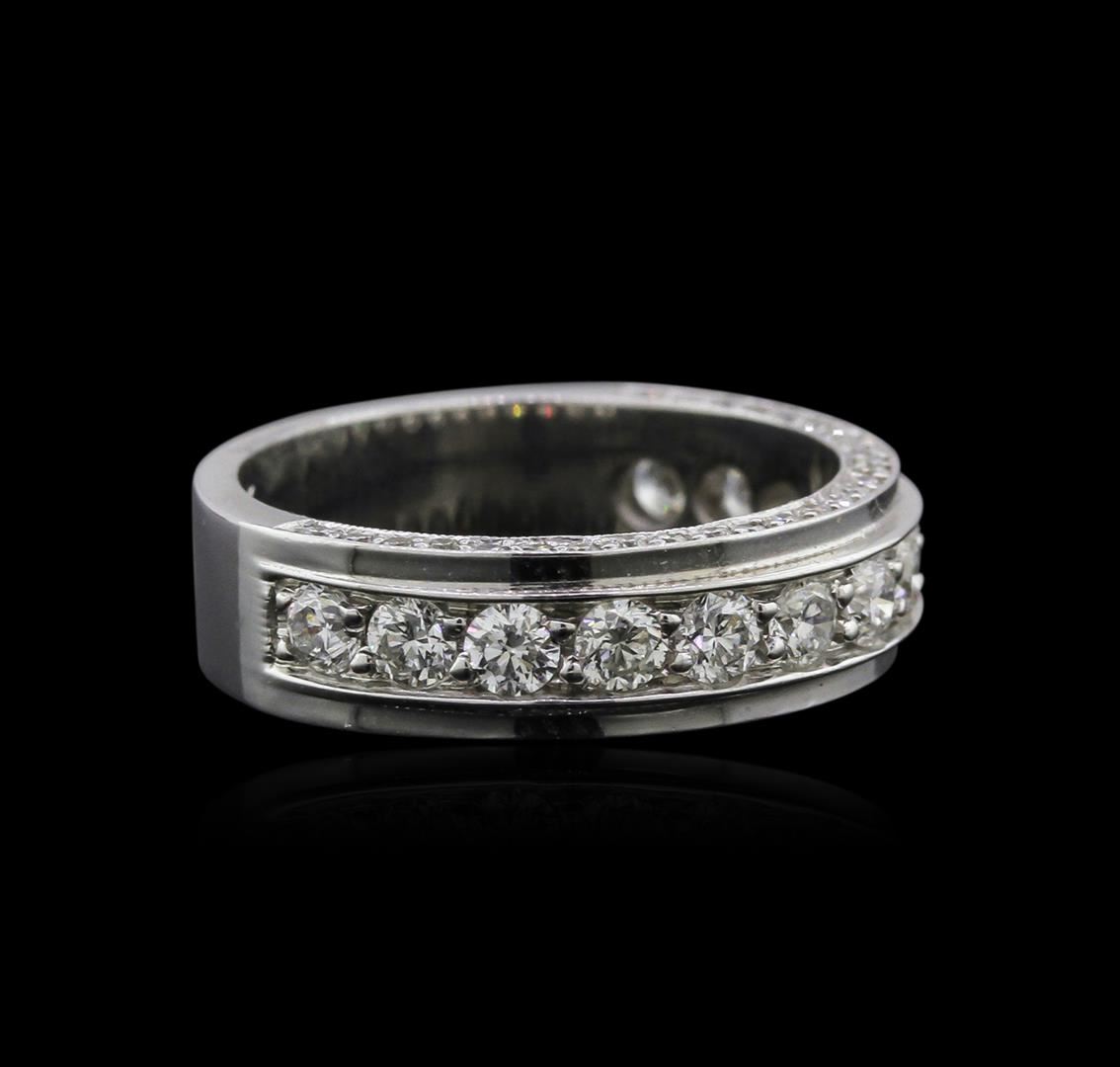 One electronically tested 18KT white gold ladies cast diamond wedding band with a bright polish finish. Identified with markings of "18K". Condition is new. Containing: Thirteen channel set round brilliant cut diamonds, measuring 2.50 - 2.50 x 1.50mm (depth est.) approximate. Total Weight of 13 Stones = 0.74ct. Clarity: SI-1. Color: I - J, Cut is Good. Fifty-Four prong set round brilliant cut diamonds, measuring 1.00 - 1.00 x 0.60mm (depth est.) approximate. Total Weight of 54 Stones = 0.19ct. Clarity: I-1 to I-2. Color: I - J, Cut is Good. All diamonds are graded in the mounting, unless otherwise stated. Total Weight of Diamonds 0.94ct. Total Weight of Wedding Band 5.50 grams. GGL Appraised at $3,655.00.