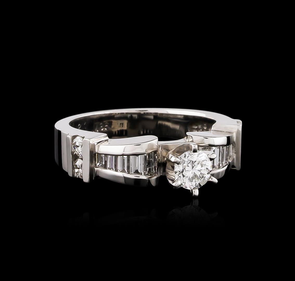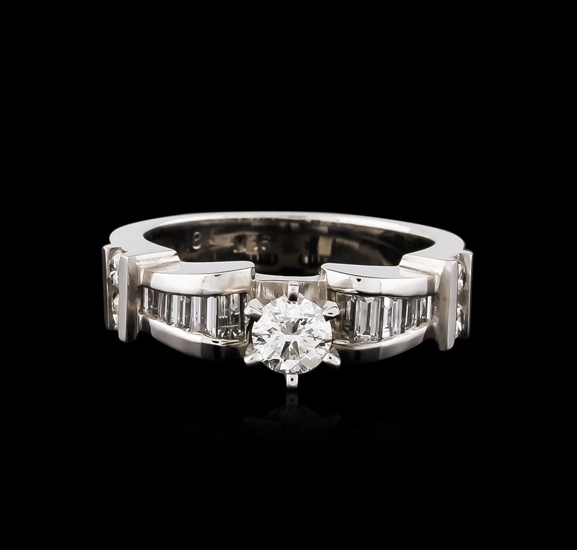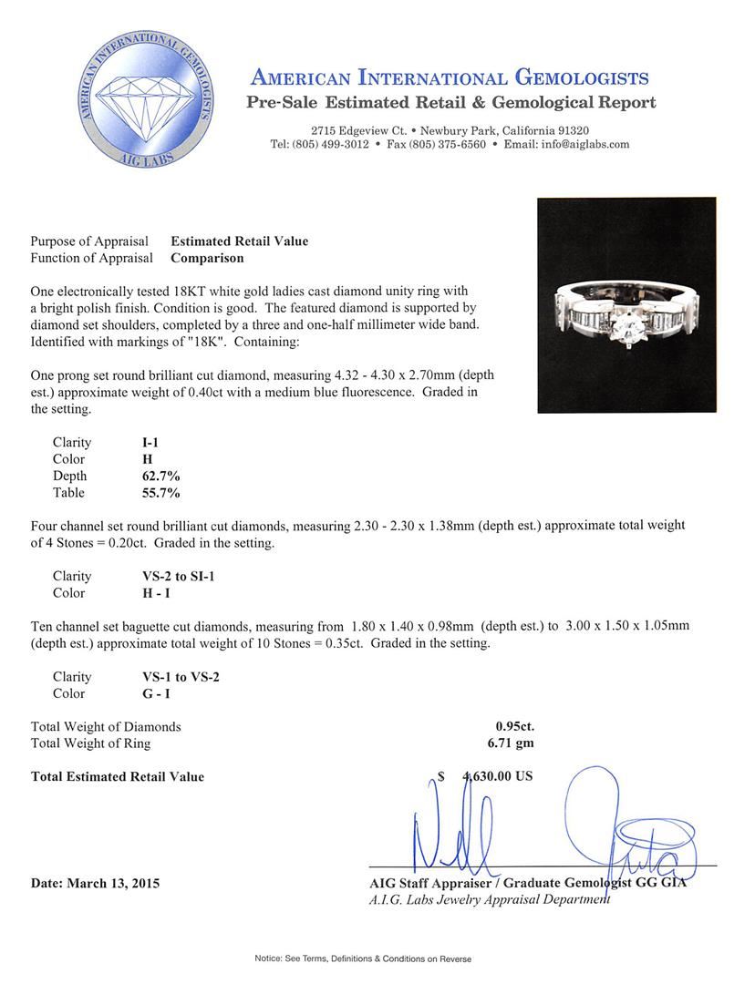 One electronically tested 18KT white gold ladies cast diamond unity ring with a bright polish finish. The featured diamond is supported by diamond set shoulders, completed by a three and one-half millimeter wide band. Identified with markings of "18K". Condition is good. Containing: One prong set round brilliant cut diamond, measuring 4.32 - 4.30 x 2.70mm (depth est.) approximate weight of 0.40ct with a medium blue fluorescence. Graded in the setting. Clarity: I-1. Color: H. Depth 62.7%. Table 55.7%. Four channel set round brilliant cut diamonds, measuring 2.30 - 2.30 x 1.38mm (depth est.) approximate total weight of 4 Stones = 0.20ct. Graded in the setting. Clarity: VS-2 to SI-1. Color: H - I Ten channel set baguette cut diamonds, measuring from 1.80 x 1.40 x 0.98mm (depth est.) to 3.00 x 1.50 x 1.05mm (depth est.) approximate total weight of 10 Stones = 0.35ct. Graded in the setting. Clarity: VS-1 to VS-2. Color: G - I. Total Weight of Diamonds 0.95ct. Total Weight of Ring 6.71 grams. AIG Appraised at $4,630.00.
