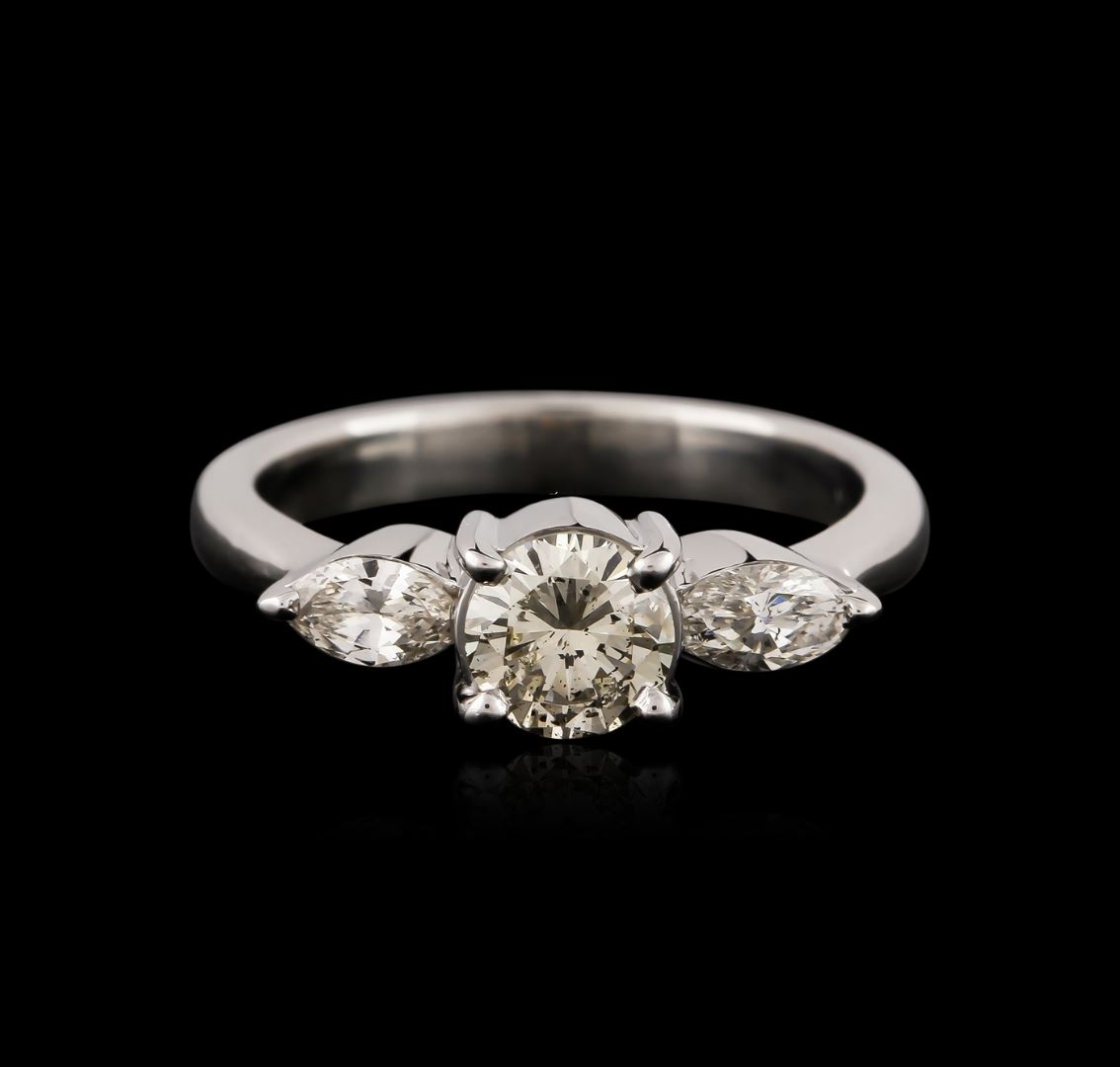 One electronically tested 18KT white gold ladies cast diamond engagement ring with a bright polish finish. Identified with markings of "18K". Condition is very good. Containing: One prong set round brilliant cut diamond, measuring 5.50 - 5.50 x 3.30mm (depth est.) approximate weight of 0.61ct. Clarity: I-2. Color: M, Cut is Good. Two prong set marquise shaped cut diamonds, measuring 4.60 x 2.90 x 2.25mm (depth est.) approximate total weight of 2 Stones = 0.35ct. Clarity: SI-1 to I-1. Color: K, Cut is Good. All diamonds are graded in the mounting, unless otherwise stated. Total Weight of Diamonds 0.96ct. Total Weight of Engagement Ring 4.80 grams. GGL Appraised at $3,055.00.