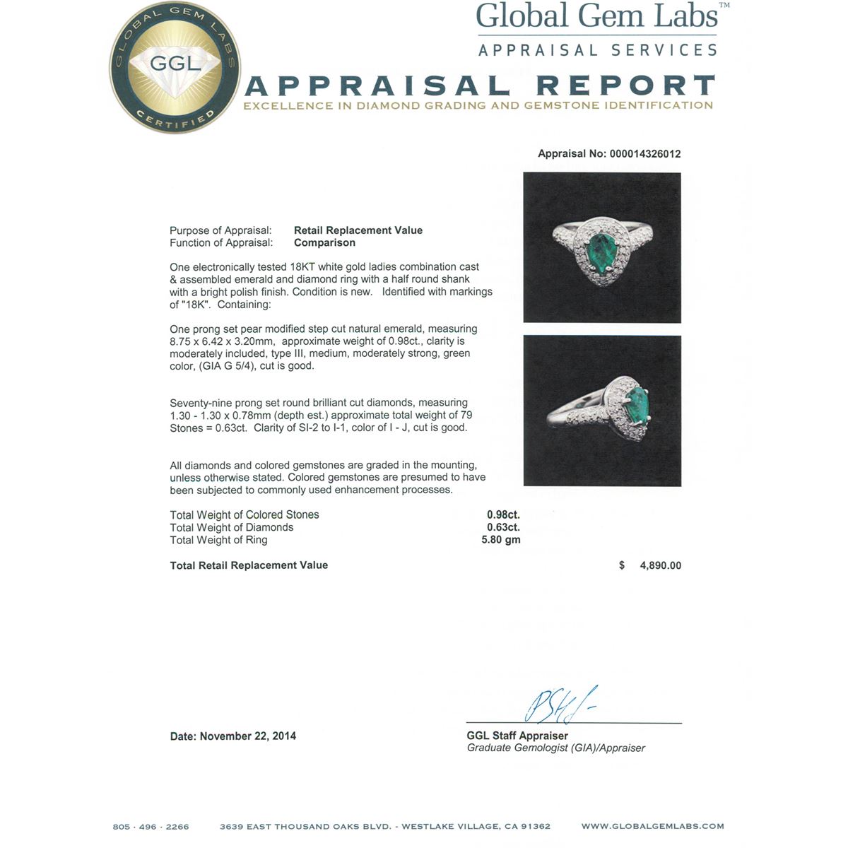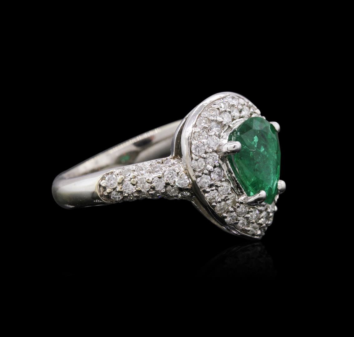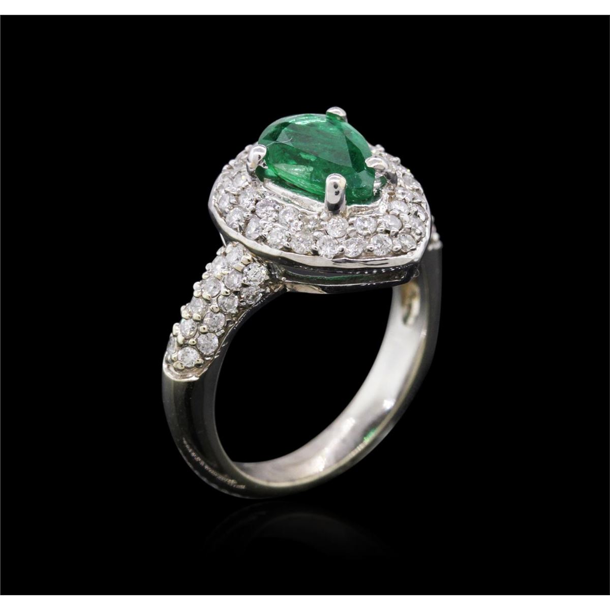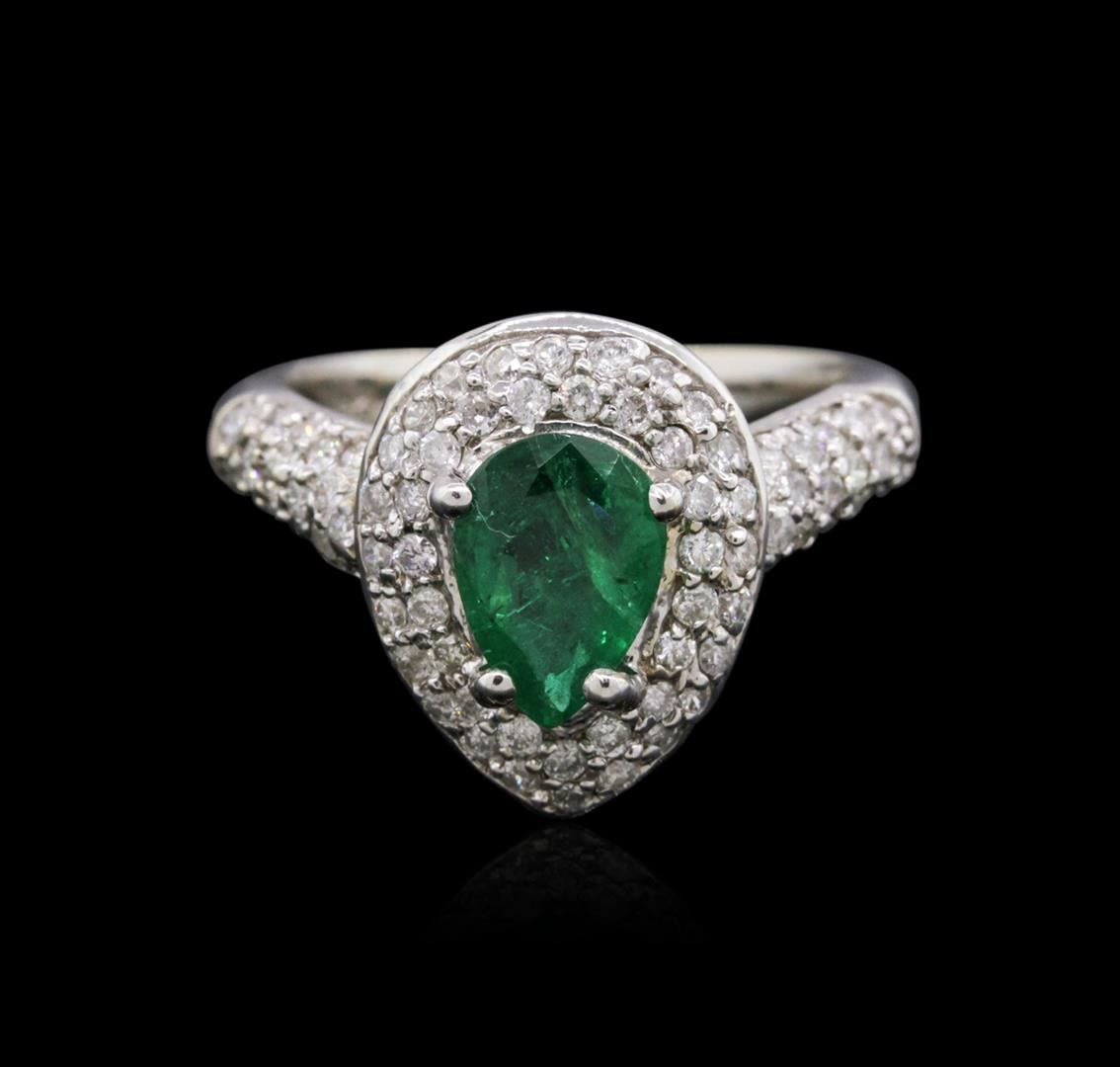 One electronically tested 18KT white gold ladies combination cast & assembled emerald and diamond ring with a half round shank with a bright polish finish. Identified with markings of "18K". Condition is new. Containing: One prong set pear modified step cut natural emerald, measuring 8.75 x 6.42 x 3.20mm, approximate weight of 0.98ct., clarity is moderately included, type III, medium, moderately strong, green color, (GIA G 5/4), cut is good. Seventy-Nine prong set round brilliant cut diamonds, measuring 1.30 - 1.30 x 0.78mm (depth est.) approximate total weight of 79 Stones = 0.63ct. Clarity: SI-2 to I-1. Color: I - J, Cut is Good. All diamonds and colored gemstones are graded in the mounting, unless otherwise stated. Colored gemstones are presumed to have been subjected to commonly used enhancement processes. Total Weight of Colored Stones 0.98ct. Total Weight of Diamonds 0.63ct. Total Weight of Ring 5.80 grams. GGL Appraised at $4,890.00.