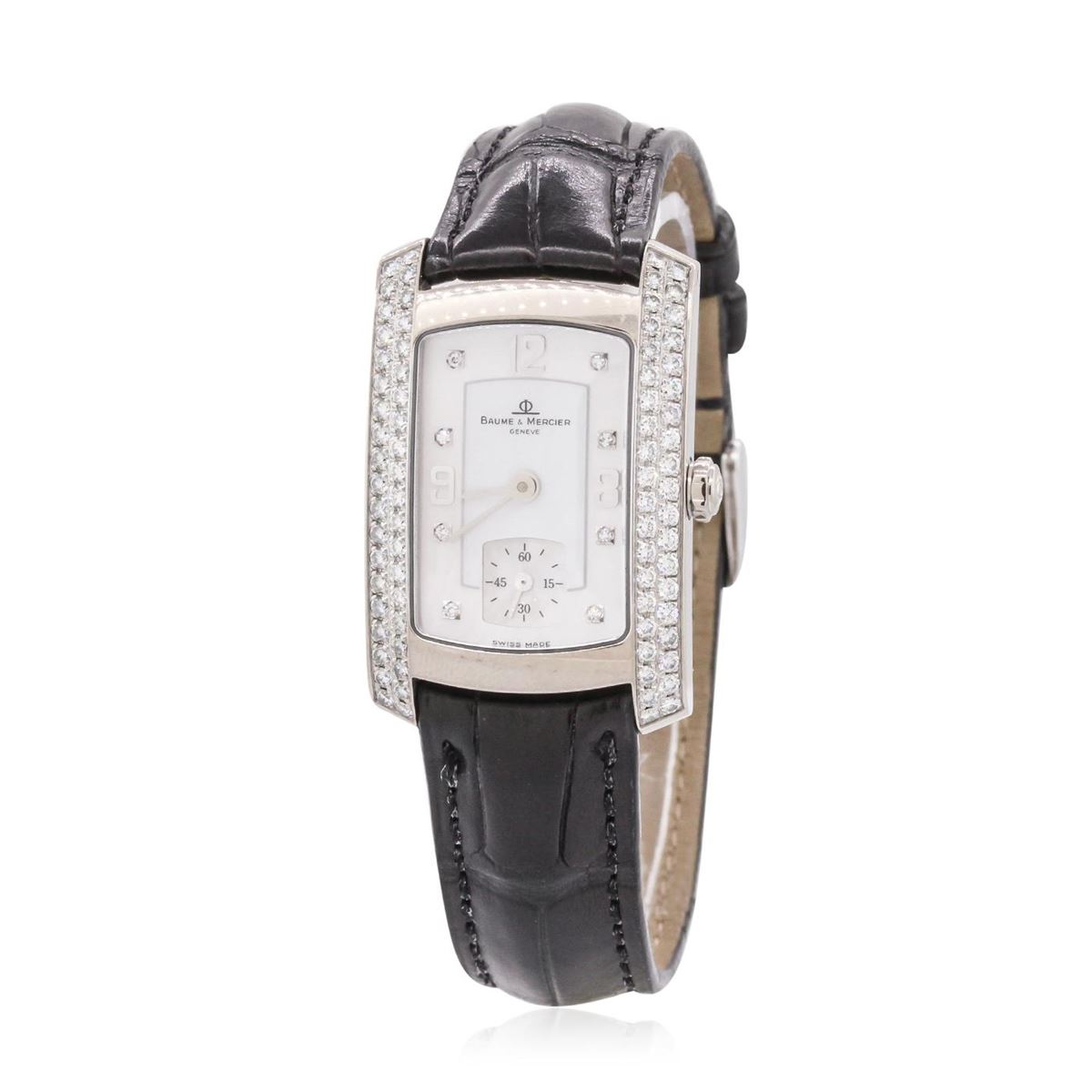 One ladies, Baume & Mercier Hampton wristwatch electronically tested 18KT white gold, Case: 34 x 22mm, Case Back: secured by four set screws, engraved with the manufacturers name, logo, and ID numbers, Bezel: diamond set, Crystal: synthetic sapphire lens. Movement: quartz, Dial: mother of pearl, with baton type hands, numerals and diamond markers, Seconds Sub Dial: 6 o'clock position, Bracelet: Baume & Mercier Black saddle stitched leather strap, Condition: G-5 Fine. Six and three quarter inch length, adjustable. 18KT white gold clasp, with logo. Containing: Seventy Eight round brilliant cut diamonds, measuring an average of 1.55mm in diameter, approximate total weight equals 1.00ct. Set & graded in the custom bezel. Clarity VVS-2 to VS-2. Color: F - G. Total Weight of Diamonds 1.00ct. Total Weight of Watch 33.06gm. AIG Appraised at $5,880.00.