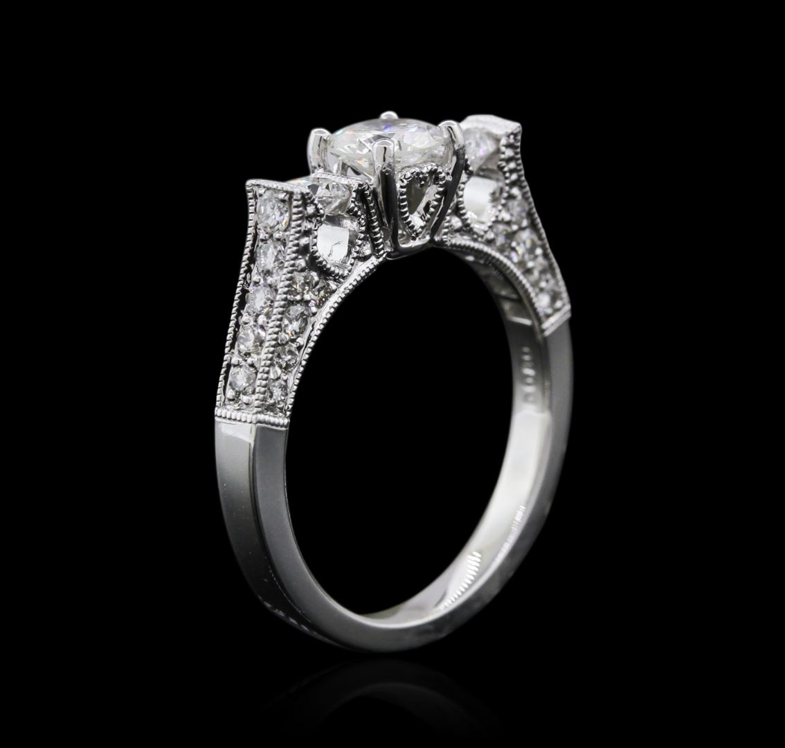One electronically tested 18KT white gold ladies cast diamond engagement ring with a bright polish finish. Identified with markings of "18K". Condition is new. Containing: One prong set round brilliant cut diamond, measuring 5.30 - 5.30 x 3.31mm (depth est.) approximate weight of 0.57ct. Clarity: SI-2. Color: G, Cut is Good. Two prong set round brilliant cut diamonds, measuring 3.00 - 3.00 x 1.80mm (depth est.) approximate total weight of 2 Stones = 0.20ct. Clarity: SI-1. Color: H - I, Cut is Good. Thirty prong set round brilliant cut diamonds, measuring 1.50 - 1.20 x 0.81mm (depth est.) approximate total weight of 30 Stones = 0.27ct. Clarity: SI-1. Color: I - J, Cut is Good. All diamonds are graded in the mounting, unless otherwise stated. Total Weight of Diamonds 1.04ct. Total Weight of Engagement Ring 5.00 grams. GGL Appraised at $7,665.00.