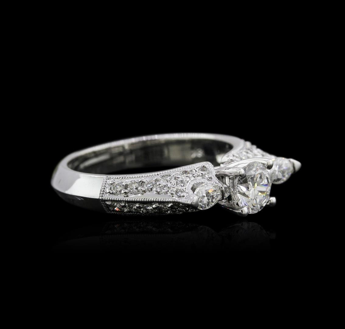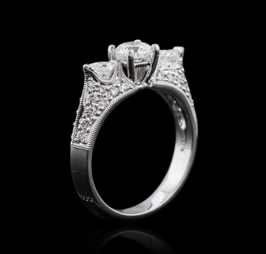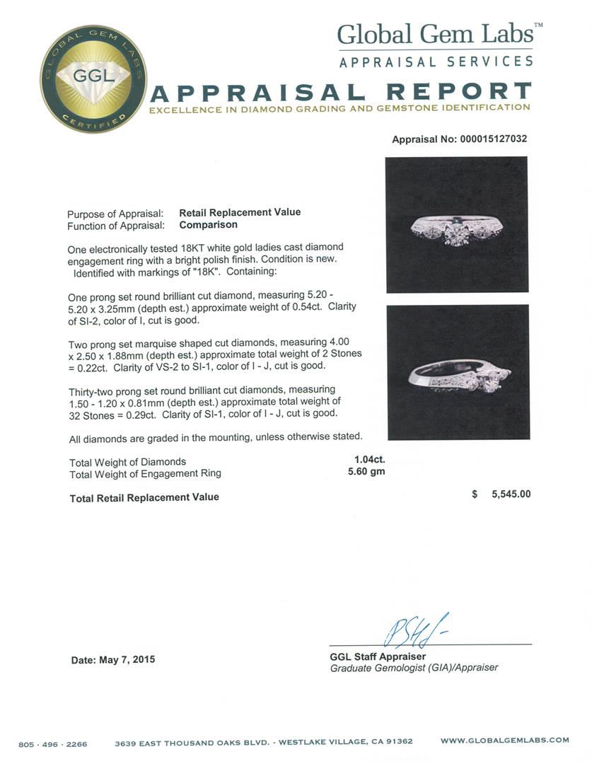 One electronically tested 18KT white gold ladies cast diamond engagement ring with a bright polish finish. Identified with markings of "18K". Condition is new. Containing: One prong set round brilliant cut diamond, measuring 5.20 - 5.20 x 3.25mm (depth est.) approximate weight of 0.54ct. Clarity: SI-2. Color: I, Cut is Good. Two prong set marquise shaped cut diamonds, measuring 4.00 x 2.50 x 1.88mm (depth est.) approximate total weight of 2 Stones = 0.22ct. Clarity: VS-2 to SI-1. Color: I - J, Cut is Good. Thirty-Two prong set round brilliant cut diamonds, measuring 1.50 - 1.20 x 0.81mm (depth est.) approximate total weight of 32 Stones = 0.29ct. Clarity: SI-1. Color: I - J, Cut is Good. All diamonds are graded in the mounting, unless otherwise stated. Total Weight of Diamonds 1.04ct. Total Weight of Engagement Ring 5.60 grams. GGL Appraised at $5,545.00.