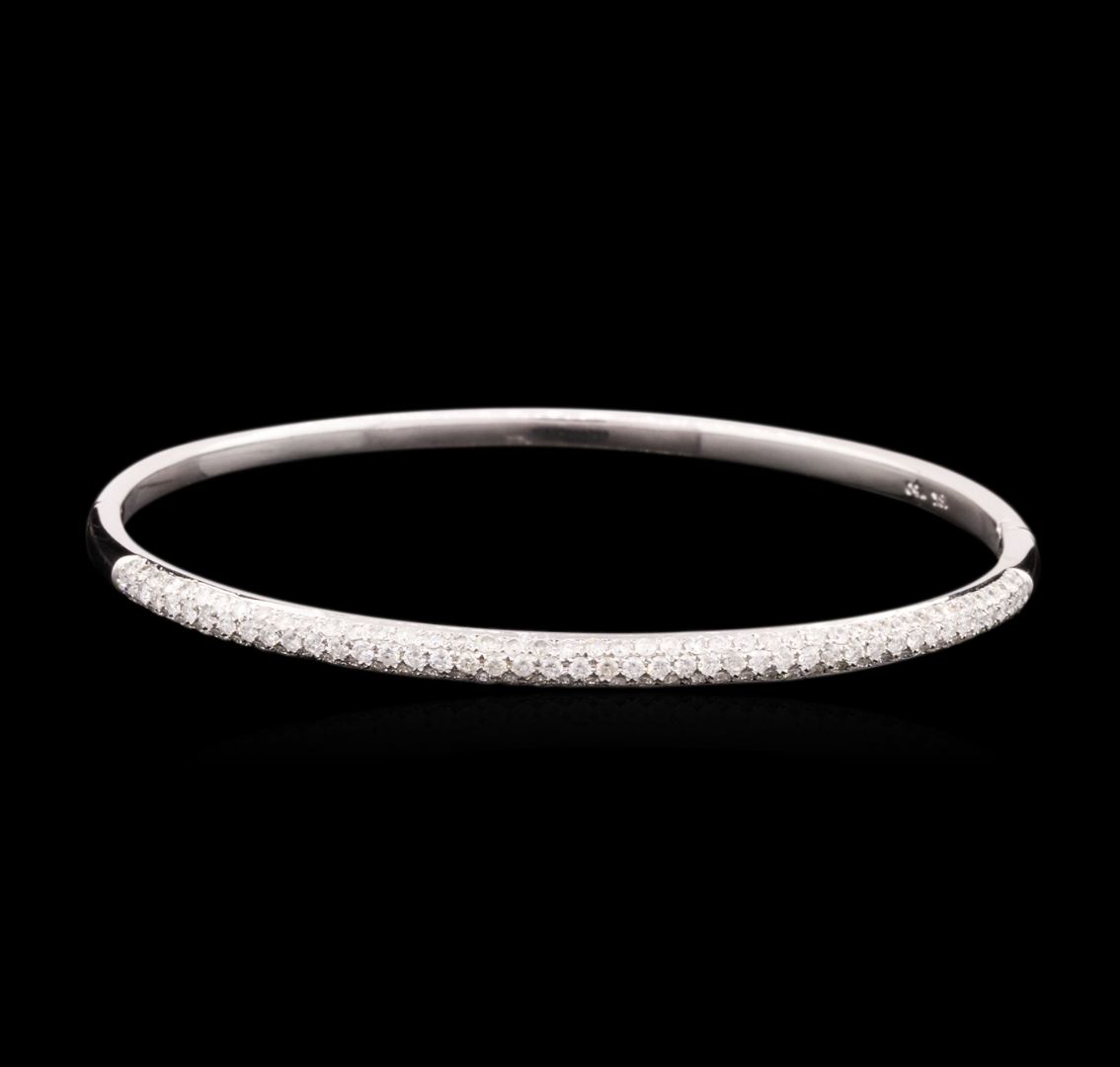 One electronically tested 18KT white gold ladies cast diamond bangle bracelet with a hidden box clasp with a bright polish finish. Identified with markings of "18K 750". Condition is new. Containing: One Hundred Thirty-Three prong set round brilliant cut diamonds, measuring 1.30 - 1.30 x 0.78mm (depth est.) approximate total weight of 133 Stones = 1.06ct. Clarity: I-1 to I-2. Color: G - H, Cut is Good. All diamonds are graded in the mounting, unless otherwise stated. Total Weight of Diamonds 1.06ct. Total Weight of Bangle Bracelet 10.40 grams. GGL Appraised at $4,055.00.