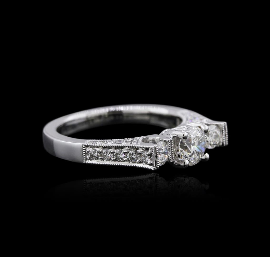 One electronically tested 18KT white gold ladies cast diamond engagement ring with a bright polish finish. Identified with markings of "18K". Condition is new. Containing: One prong set round brilliant cut diamond, measuring 5.40 - 5.40 x 3.37mm (depth est.) approximate weight of 0.60ct. Clarity: SI-2. Color: J, Cut is Good. Two prong set round brilliant cut diamonds, measuring 3.00 - 3.00 x 1.80mm (depth est.) approximate total weight of 2 Stones = 0.20ct. Clarity: SI-1. Color: H - I, Cut is Good. Thirty prong set round brilliant cut diamonds, measuring 1.50 - 1.20 x 0.81mm (depth est.) approximate total weight of 30 Stones = 0.27ct. Clarity: SI-1 to SI-2. Color: I - J, Cut is Good. All diamonds are graded in the mounting, unless otherwise stated. Total Weight of Diamonds 1.07ct. Total Weight of Engagement Ring 5.30 grams. GGL Appraised at $5,035.00.
