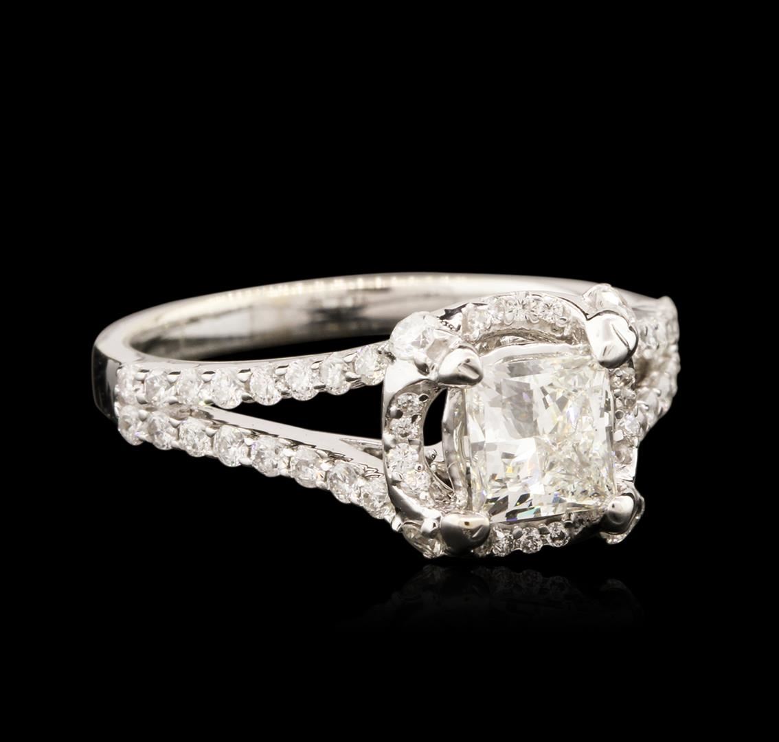 One electronically tested 18KT white gold ladies combination cast & assembled diamond engagement ring with a flat shank with a bright polish finish. Identified with markings of "750". Condition is new. Containing: One prong set princess cut diamond, measuring 5.05 x 5.04 x 3.78mm (depth est.) approximate weight of 0.79ct. Clarity: SI-1. Color: L, Cut is Good. Forty-Eight prong set round brilliant cut diamonds, measuring 1.20 - 1.20 x 0.72mm (depth est.) approximate total weight of 48 Stones = 0.30ct. Clarity: SI-2 to I-1. Color: I - J, Cut is Good. All diamonds are graded in the mounting, unless otherwise stated. Total Weight of Diamonds 1.09ct. Total Weight of Engagement Ring 3.90 grams. GGL Appraised at $5,850.00.